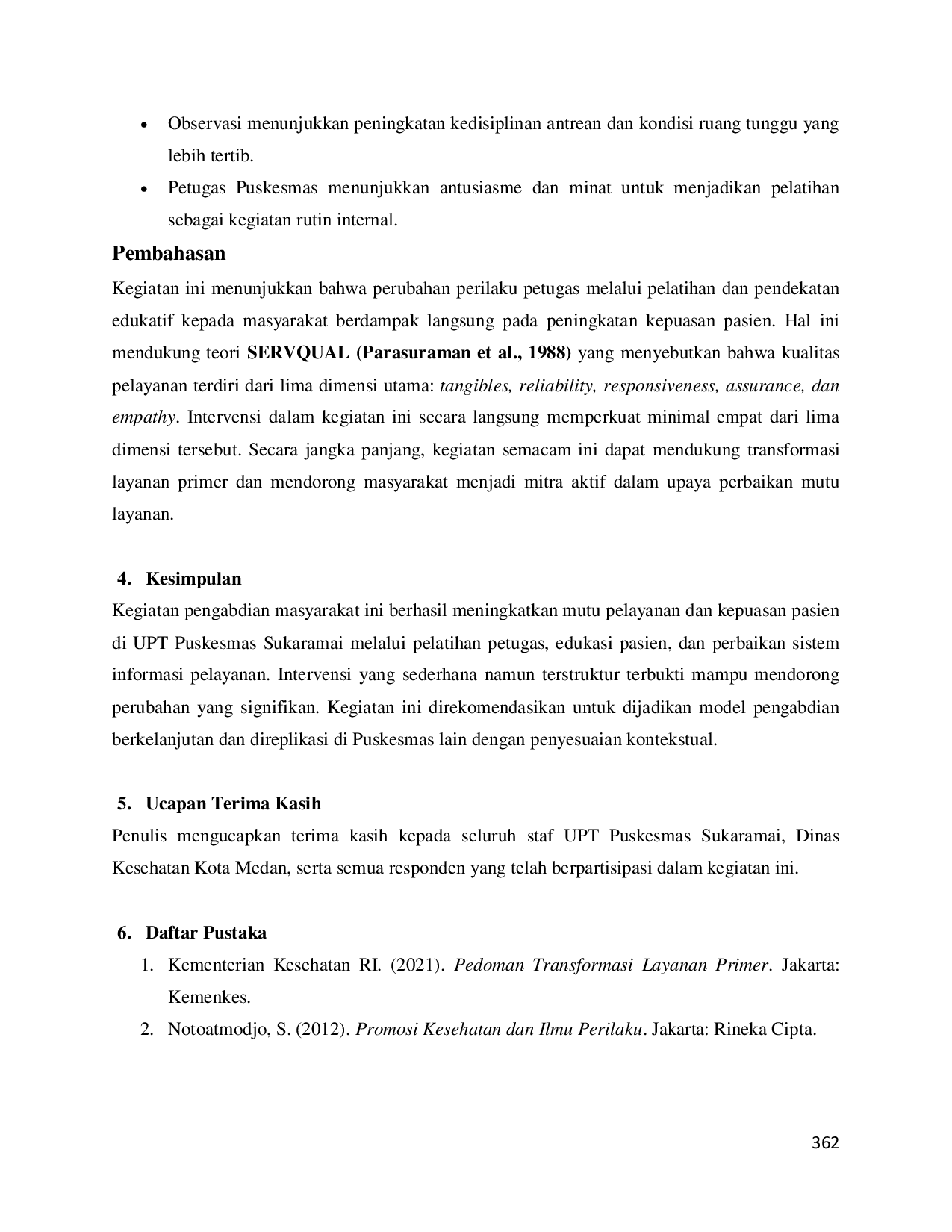 Kegiatan pengabdian masyarakat ini berhasil meningkatkan mutu pelayanan dan kepuasan pasien di UPT Puskesmas Sukaramai melalui pelatihan petugas, edukasi pasien, dan perbaikan sistem informasi pelayanan.Intervensi yang sederhana namun terstruktur terbukti mampu mendorong perubahan yang signifikan.Kegiatan ini direkomendasikan untuk dijadikan model pengabdian berkelanjutan dan direplikasi di Puskesmas lain dengan penyesuaian kontekstual.