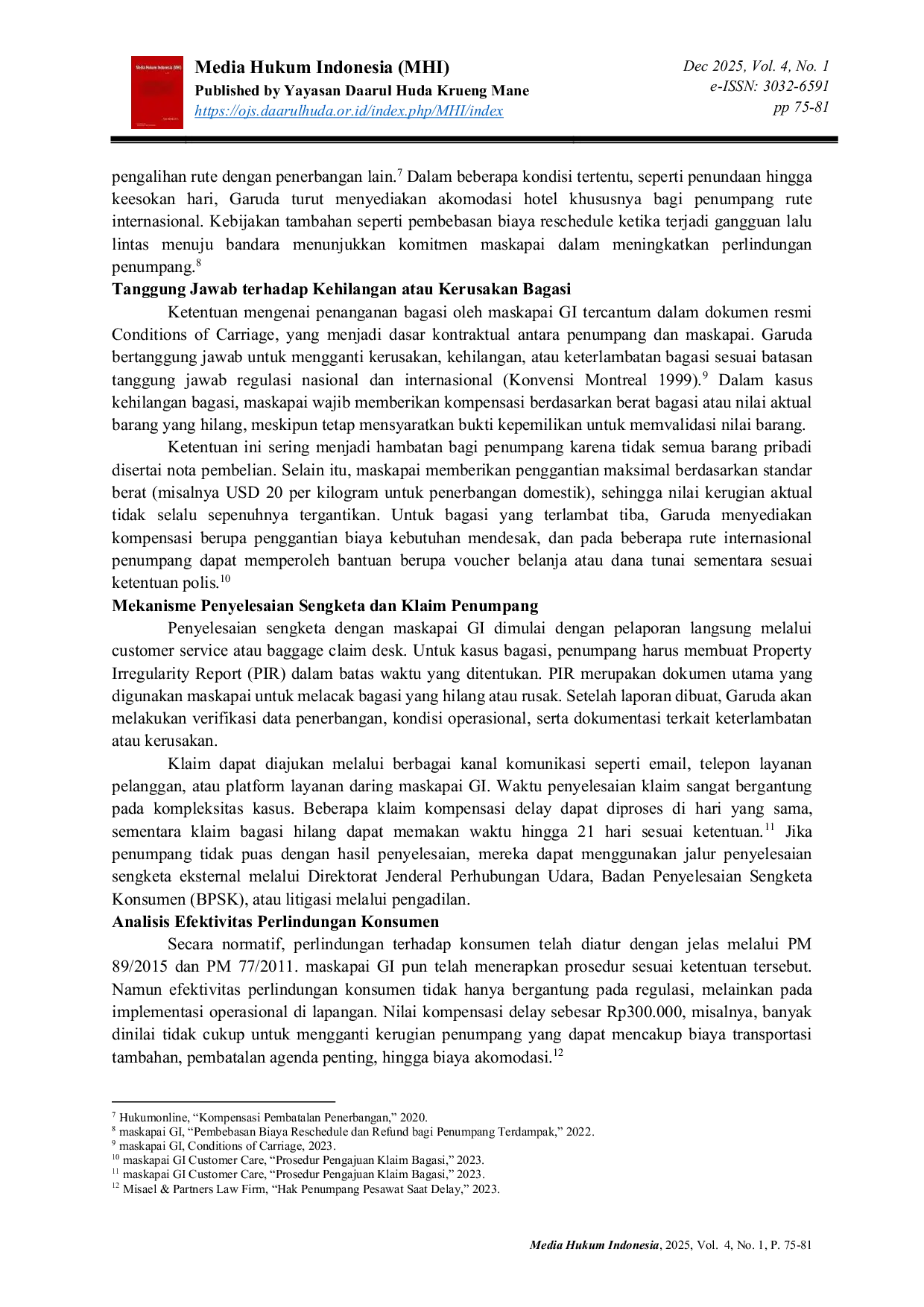 Dapat disimpulkan bahwa perlindungan konsumen dalam konteks ini baru tercapai pada tataran normatif-formal, namun belum mampu menghadirkan keadilan kontraktual yang bersifat materiil bagi pengguna jasa.Maskapai GI perlu melakukan restrukturisasi internal terhadap klausul-klausul dalam Conditions of Carriage yang terindikasi mengandung unsur eksonerasi.