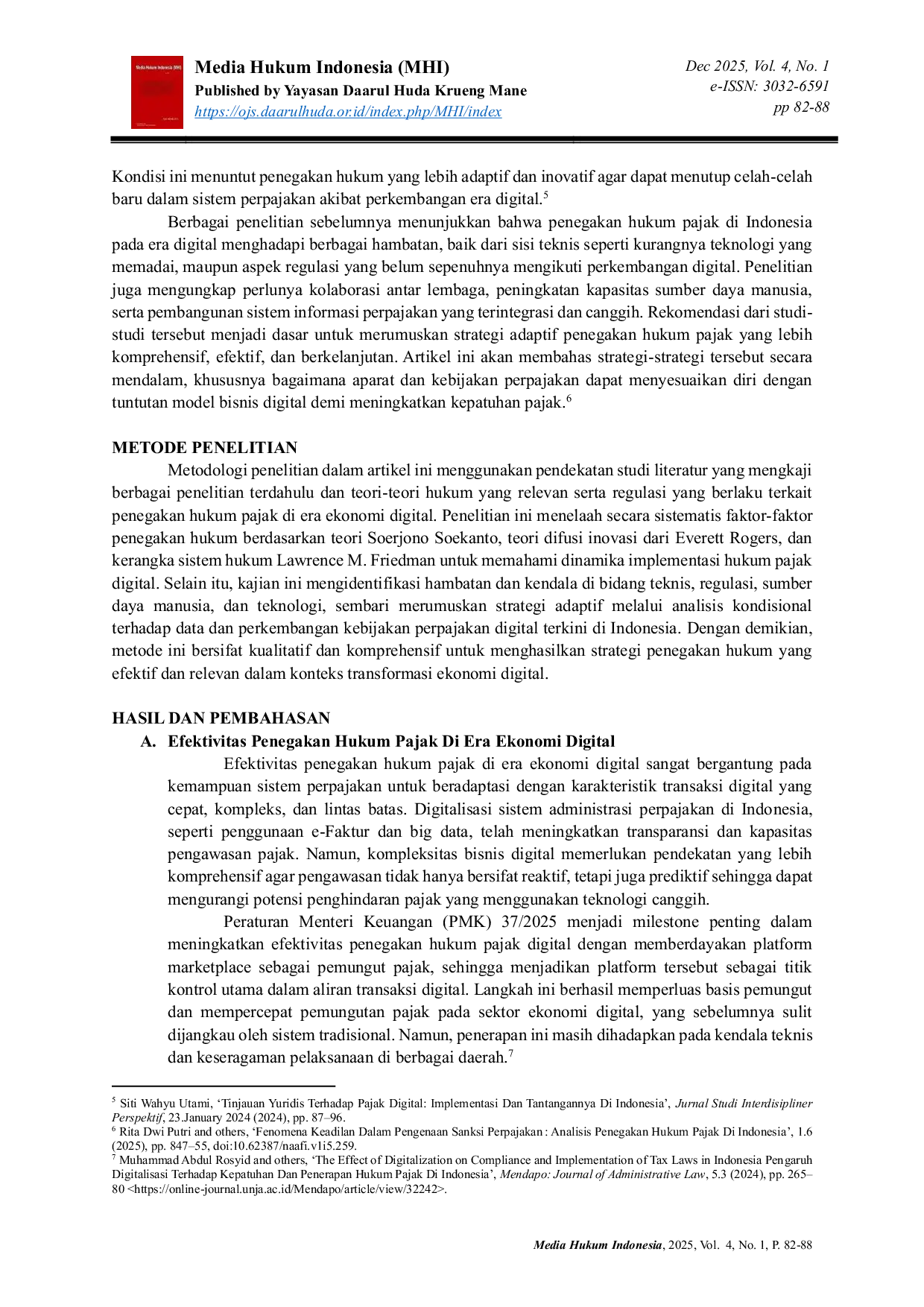 Penegakan hukum pajak di era ekonomi digital memerlukan strategi adaptif yang menyesuaikan dengan perubahan cepat dan kompleks dalam model bisnis digital, termasuk transaksi lintas negara dan penggunaan teknologi canggih.Meski digitalisasi telah meningkatkan transparansi dan pengawasan melalui e-Faktur dan big data, penegakan hukum pajak digital menghadapi kendala seperti keterbatasan kapasitas SDM aparat pajak, regulasi yang belum menyentuh seluruh aktivitas ekonomi digital, dan kesulitan mengawasi transaksi lintas yurisdiksi.Strategi utama meliputi penguatan sistem data dan teknologi, peran aktif platform digital sebagai pemungut pajak, serta edukasi wajib pajak melalui program literasi digital, dengan kolaborasi lintas sektoral untuk integrasi data dan pengawasan menyeluruh terhadap transaksi digital dan aset kripto.