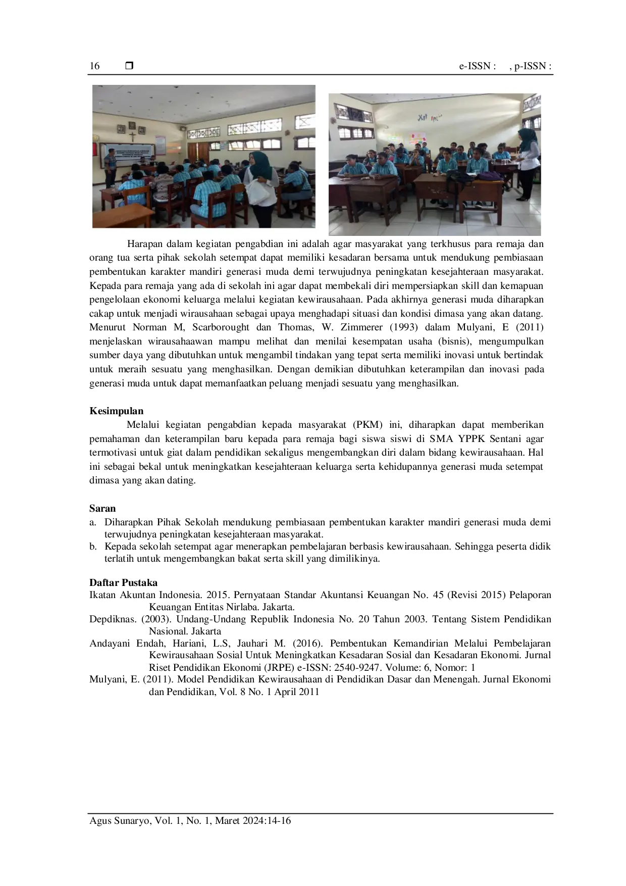 Cendisia : Cendekia Sosial dan PengabdianCendisia : Cendekia Sosial dan PengabdianKarakter mandiri generasi muda sejatinya menjadi poin penting dalam tujuan pendidikan nasional. Sebagaimana tercantum dalam Undang-Undang Sistem Pendidikan Nasional Pendidikan No 20 Tahun 2003 pasal 3 menyebut “pendidikan nasional berfungsi mengembangkan kemampuan dan mmbentuk watak serta peradaban bangsa yang bermartabat dalam rangka mencerdaskan kehidupan bangsa. Pendekatan atau metode yang digunakan pada kegiatan sosialisasi ini adalah ceramah, tanya jawab dan pemberian motivasi. Dengan adanya kegiatan sosialisasi ini dapat memberikan wawasan yang luas kepada siswa-siswi tentang membangun karakter mandiri generasi muda melalui pendidikan berbasis kewirausahaan. Hasil dari kegiatan sosialisasi ini, memberikan pemahaman kepada para remaja terhadap pentingnya pendidikan berbasis kewirausahaan sebagai upaya untuk membekali karakter kemandirian dalam mengelola usaha yang didirikan. Selanjutnya mengharapkan guru dan orang tua agar mendukung kreaktivitas anak didiknya sebagai upaya pengembangan diri. Melalui kegiatan pengabdian kepada masyarakat (PKM) ini, diharapkan dapat memberikan pemahaman dan keterampilan baru kepada para remaja bagi siswa siswi di SMA YPPK Sentani agar termotivasi untuk giat dalam pendidikan sekaligus mengembangkan diri dalam bidang kewirausahaan.