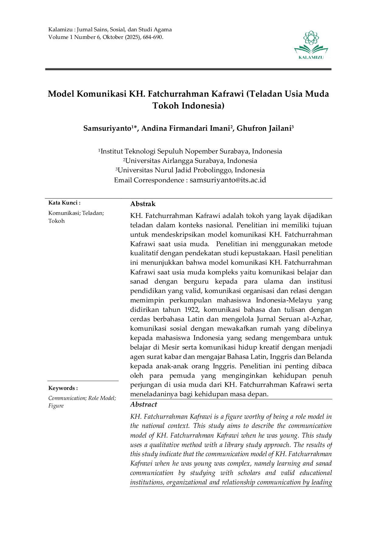 Neo Journal of economy and social humanitiesNeo Journal of economy and social humanitiesKH. Fatchurrahman Kafrawi adalah tokoh yang layak dijadikan teladan dalam konteks nasional. Penelitian ini bertujuan untuk mendeskripsikan model komunikasi KH. Fatchurrahman Kafrawi saat usia muda. Penelitian ini menggunakan metode kualitatif dengan pendekatan studi kepustakaan. Hasil penelitian ini menunjukkan bahwa model komunikasi KH. Fatchurrahman Kafrawi saat usia muda kompleks, yaitu komunikasi belajar dan sanad dengan berguru kepada para ulama dan institusi pendidikan yang valid, komunikasi organisasi dan relasi dengan memimpin perkumpulan mahasiswa Indonesia-Melayu yang didirikan tahun 1922, komunikasi bahasa dan tulisan dengan cerdas berbahasa Latin dan mengelola Jurnal Seruan al-Azhar, komunikasi sosial dengan mewakafkan rumah yang dibelinya kepada mahasiswa Indonesia yang sedang mengembara untuk belajar di Mesir serta komunikasi hidup kreatif dengan menjadi agen surat kabar dan mengajar Bahasa Latin, Inggris dan Belanda kepada anak-anak orang Inggris. Penelitian ini penting dibaca oleh para pemuda yang menginginkan kehidupan penuh perjuangan di usia muda dari KH. Fatchurrahman Kafrawi serta meneladaninya bagi kehidupan masa depan.