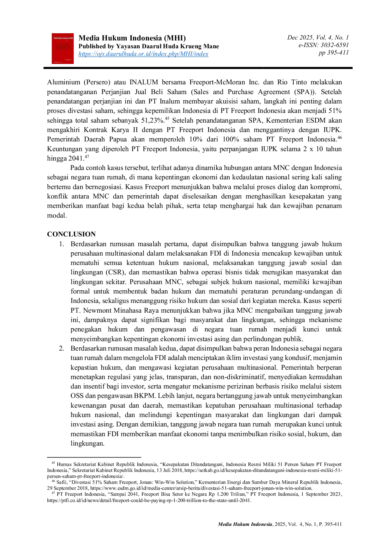 Tanggung jawab hukum perusahaan multinasional dalam melaksanakan FDI di Indonesia mencakup kewajiban mematuhi semua ketentuan hukum nasional, melaksanakan tanggung jawab sosial dan lingkungan (CSR), serta memastikan operasi bisnis tidak merugikan masyarakat dan lingkungan sekitar.MNC, sebagai subjek hukum nasional, memiliki kewajiban formal untuk membentuk badan hukum dan mematuhi peraturan perundang-undangan di Indonesia, sekaligus menanggung risiko hukum dan sosial dari kegiatan mereka.Newmont Minahasa Raya menunjukkan bahwa jika MNC mengabaikan tanggung jawab ini, dampaknya dapat signifikan bagi masyarakat dan lingkungan, sehingga mekanisme penegakan hukum dan pengawasan di negara tuan rumah menjadi kunci untuk menyeimbangkan kepentingan ekonomi investasi asing dan perlindungan publik.Peran Indonesia sebagai negara tuan rumah dalam mengelola FDI adalah menciptakan iklim investasi yang kondusif, menjamin kepastian hukum, dan mengawasi kegiatan perusahaan multinasional.Pemerintah berperan menetapkan regulasi yang jelas, transparan, dan non-diskriminatif, menyediakan kemudahan dan insentif bagi investor, serta mengatur mekanisme perizinan berbasis risiko melalui sistem OSS dan pengawasan BKPM.Lebih lanjut, negara bertanggung jawab untuk menyeimbangkan kewenangan pusat dan daerah, memastikan kepatuhan perusahaan multinasional terhadap hukum nasional, dan melindungi kepentingan masyarakat dan lingkungan dari dampak investasi asing.Dengan demikian, tanggung jawab negara tuan rumah merupakan kunci untuk memastikan FDI memberikan manfaat ekonomi tanpa menimbulkan risiko sosial, hukum, dan lingkungan.Dinamika hubungan antara MNC dan Indonesia dalam FDI menunjukkan interaksi antara kepentingan ekonomi global dan kepentingan nasional.MNC berperan membawa modal dan teknologi, sedangkan Indonesia menjaga kedaulatan serta kepentingan masyarakat.Hubungan ini menuntut kepatuhan terhadap hukum dan tanggung jawab masing-masing pihak.Kasus PT Freeport Indonesia membuktikan bahwa konflik dapat diselesaikan melalui negosiasi yang menghasilkan solusi saling menguntungkan antara MNC dan negara tuan rumah.