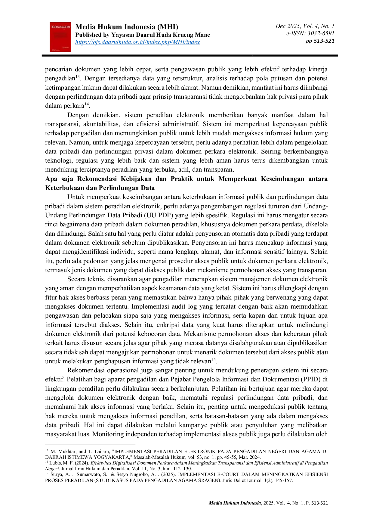 Media Hukum Indonesia (MHI)Media Hukum Indonesia (MHI)Penerapan sistem peradilan elektronik di Indonesia telah membawa banyak manfaat, seperti peningkatan transparansi dan akuntabilitas pengadilan. Namun, sistem ini juga menimbulkan tantangan terkait perlindungan data pribadi yang terkandung dalam dokumen perkara. Keterbukaan informasi publik yang lebih luas perlu diimbangi dengan regulasi yang ketat untuk menjaga privasi individu yang terlibat dalam proses hukum. Penelitian ini menganalisis tantangan dan rekomendasi kebijakan yang bertujuan untuk memperkuat keseimbangan antara transparansi dan perlindungan data pribadi dalam sistem peradilan elektronik. Rekomendasi yang diberikan meliputi pengembangan regulasi turunan UU PDP, penerapan sistem manajemen dokumen yang aman, serta pelatihan bagi aparat pengadilan dan publik tentang hak akses informasi. Penelitian ini juga mengusulkan penelitian lebih lanjut mengenai dampak keterbukaan terhadap kepercayaan publik serta studi pembanding internasional untuk meningkatkan implementasi sistem peradilan elektronik di Indonesia.