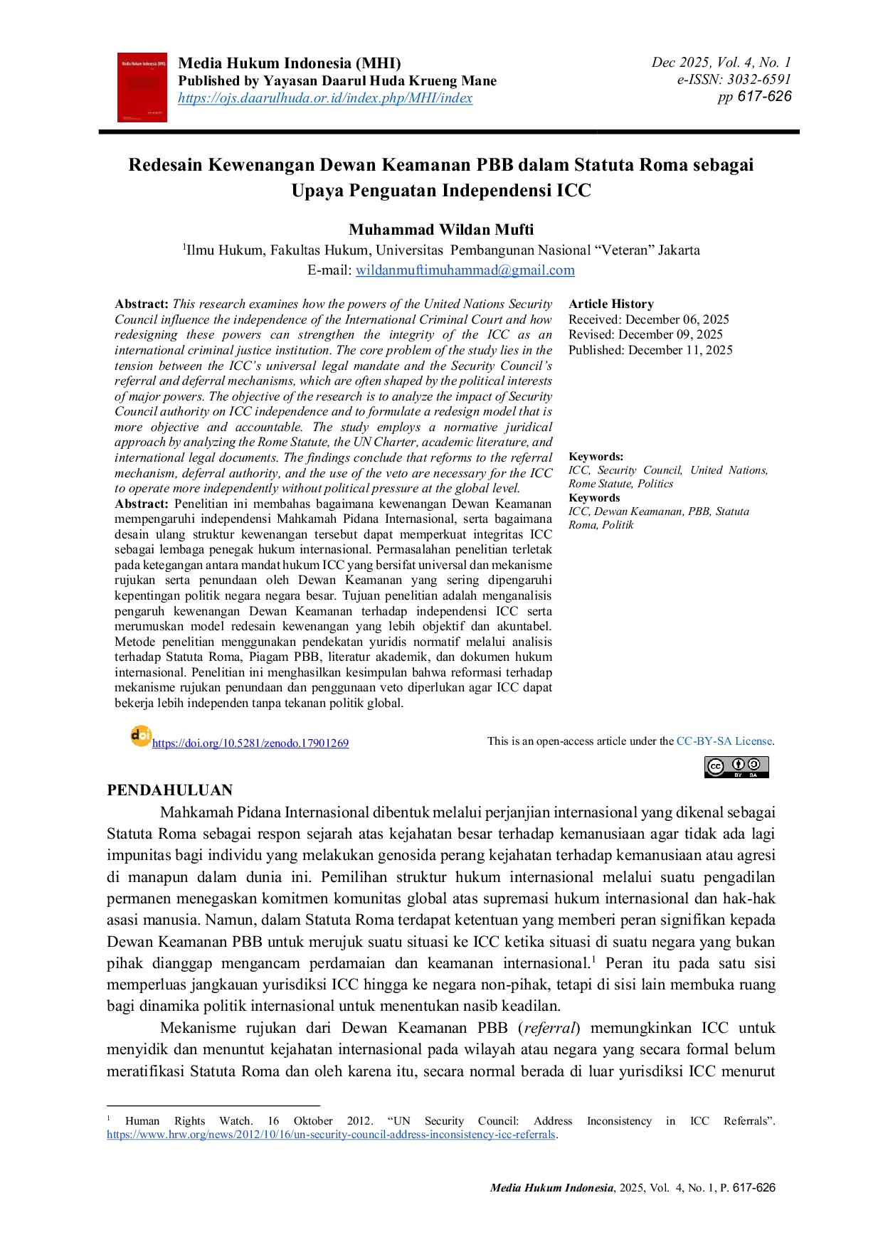 Media Hukum Indonesia (MHI)Media Hukum Indonesia (MHI)Penelitian ini membahas bagaimana kewenangan Dewan Keamanan mempengaruhi independensi Mahkamah Pidana Internasional (ICC), serta bagaimana desain ulang struktur kewenangan tersebut dapat memperkuat integritas ICC sebagai lembaga penegak hukum internasional. Permasalahan penelitian terletak pada ketegangan antara mandat hukum ICC yang bersifat universal dan mekanisme rujukan serta penundaan oleh Dewan Keamanan yang sering dipengaruhi kepentingan politik negara-negara besar. Tujuan penelitian adalah menganalisis pengaruh kewenangan Dewan Keamanan terhadap independensi ICC serta merumuskan model redesain kewenangan yang lebih objektif dan akuntabel. Metode penelitian menggunakan pendekatan yuridis normatif melalui analisis terhadap Statuta Roma, Piagam PBB, literatur akademik, dan dokumen hukum internasional. Penelitian ini menghasilkan kesimpulan bahwa reformasi terhadap mekanisme rujukan, penundaan, dan penggunaan veto diperlukan agar ICC dapat bekerja lebih independen tanpa tekanan politik global.