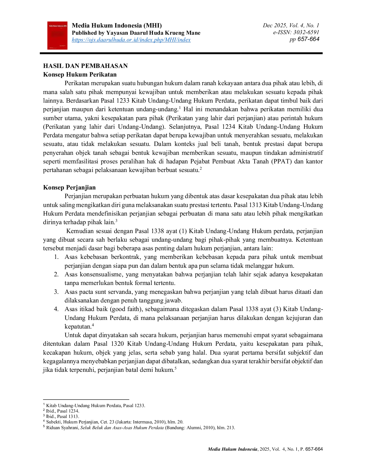 Media Hukum Indonesia (MHI)Media Hukum Indonesia (MHI)Penelitian ini menganalisis implikasi hukum perjanjian pengikatan jual beli (PPJB) tanah ketika pihak penjual meninggal dunia sebelum penandatanganan akta jual beli (AJB). Melalui studi kasus Putusan Pengadilan Negeri Jakarta Utara Nomor 711/Pdt.G/2023/PN Jkt.Utr, yang melibatkan Dedi Suwasono (pembeli) melawan ahli waris Iwan Herlambang (penjual), ditemukan bahwa kewajiban penjual beralih kepada ahli warisnya berdasarkan hukum waris. Ketika ahli waris menolak menyelesaikan peralihan hak atas tanah, tindakan tersebut dikategorikan sebagai wanprestasi (cidera janji). Putusan hakim menegaskan berlakunya asas pacta sunt servanda, memerintahkan ahli waris untuk melanjutkan dan menyelesaikan PPJB, serta membayar biaya perkara. Temuan ini menyoroti keterkaitan antara hukum perikatan, hukum waris, dan hukum tanah dalam melindungi pembeli beritikad baik, serta memberikan wawasan penting mengenai kelangsungan kewajiban kontrak pasca-meninggalnya salah satu pihak.