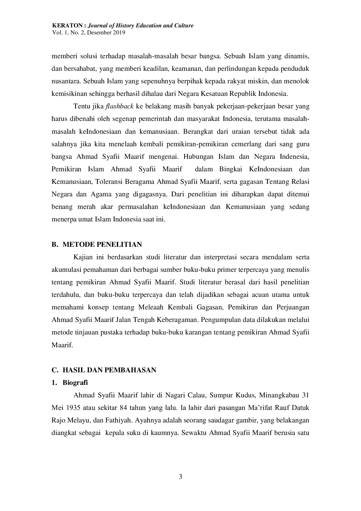Keraton: Journal of History Education and CultureKeraton: Journal of History Education and CultureKajian ini secara khusus ditulis sebagai hasil refleksi tentang keberagaman di Indonesia pada saat ini, dimana gesekan-gesekan atas nama suku, ras, agama bahkan persoalan bentuk negara selalu saja muncul di ruang publik, berangkat dari masalah diatas penulis ingin menelaah kembali gagasan, pemikiran dan perjuangan Ahmad Syafii Maarif jalan tengah keberagaman sebagai pencarian solusi atas masalah diatas. Jenis penelitian pada studi adalah studi pustaka dengan mengumpulkan buku-buku primer tentang karya dan pemikiran Ahmad Syafii Maarif baik yang ditulisnya sendiri maupun yang ditulis orang lain. Hasilnya adalah kunci penting untuk mewujudkan peradaban Islam yang gemilang di Indonesia sangat dibutuhkan integrasi antara Islam, keIndonesiaan dan kemanusiaan dimana tiga persoalan ini harus selesai agar dapat membendung gesekan-gesekan seperti yang penulis sebutkan diatas, demi tercapainya Islam yang bersahabat, memberi keadialan, keamanan dan perlindungan kepada penduduk nusantara dalam bingkai kemanusiaan.
