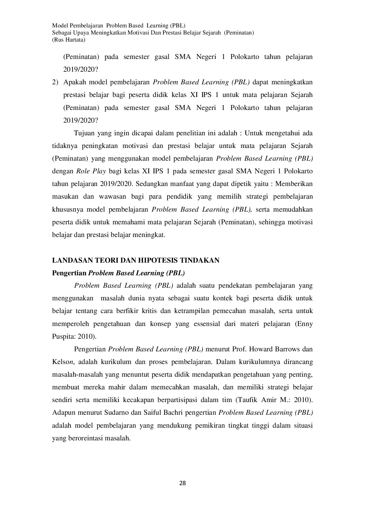 Keraton: Journal of History Education and CultureKeraton: Journal of History Education and CultureTujuan penelitian adalah meningkatkan Motivasi belajar peserta didik dan prestasi belajar Sejarah (Peminatan) menggunakan Model Pembelajaran Problem Based Learning (PBL) kelas XI IPS1 SMA Negeri 1 Polokarto semester Gasal tahun pelajaran 2019/2020. Penelitian dilaksanakan selama 4 bulan dimulai Agustus 2019 sampai November 2019, di kelas XI IPS1 SMA Negeri 1 Polokarto. Subyek penelitian: peserta didik kelas XI IPS1. Jumlah peserta didik 32. Prosedur Penelitian Tindakan Kelas dengan 2 siklus. Teknik pengumpulan data adalah teknik tes dan non tes. Alat pengumpul data berupa butir-butir soal tes tertulis dan lembar Observasi aktivitas belajar peserta didik yang dilakukan kolaborator. Hasil penelitian: Kondisi awal ke siklus 2 terjadi peningkatan motivasi belajar peserta didik dari ke-empat aspek yang dinilai yaitu: Aspek kehadiran tetap 100%, aspek interaksi dengan guru meningkat dari 15,63% menjadi 93,75%, aspek antusias dalam kelompok meningkat dari 0% menjadi 66,27%, sedangkan aspek tanggung jawab dalam pembelajaran meningkat dari 15,63% menjadi 93,75%. Pada nilai prestasi dari kondisi awal ke siklus 2 meningkat dari nilai rerata 58,91 menjadi 80,16. Nilai tertinggi naik dari 75 menjadi 95, nilai terendah naik dari 45 menjadi 65 dan ketuntasan belajar meningkat dari 31,25% menjadi 90,63%.