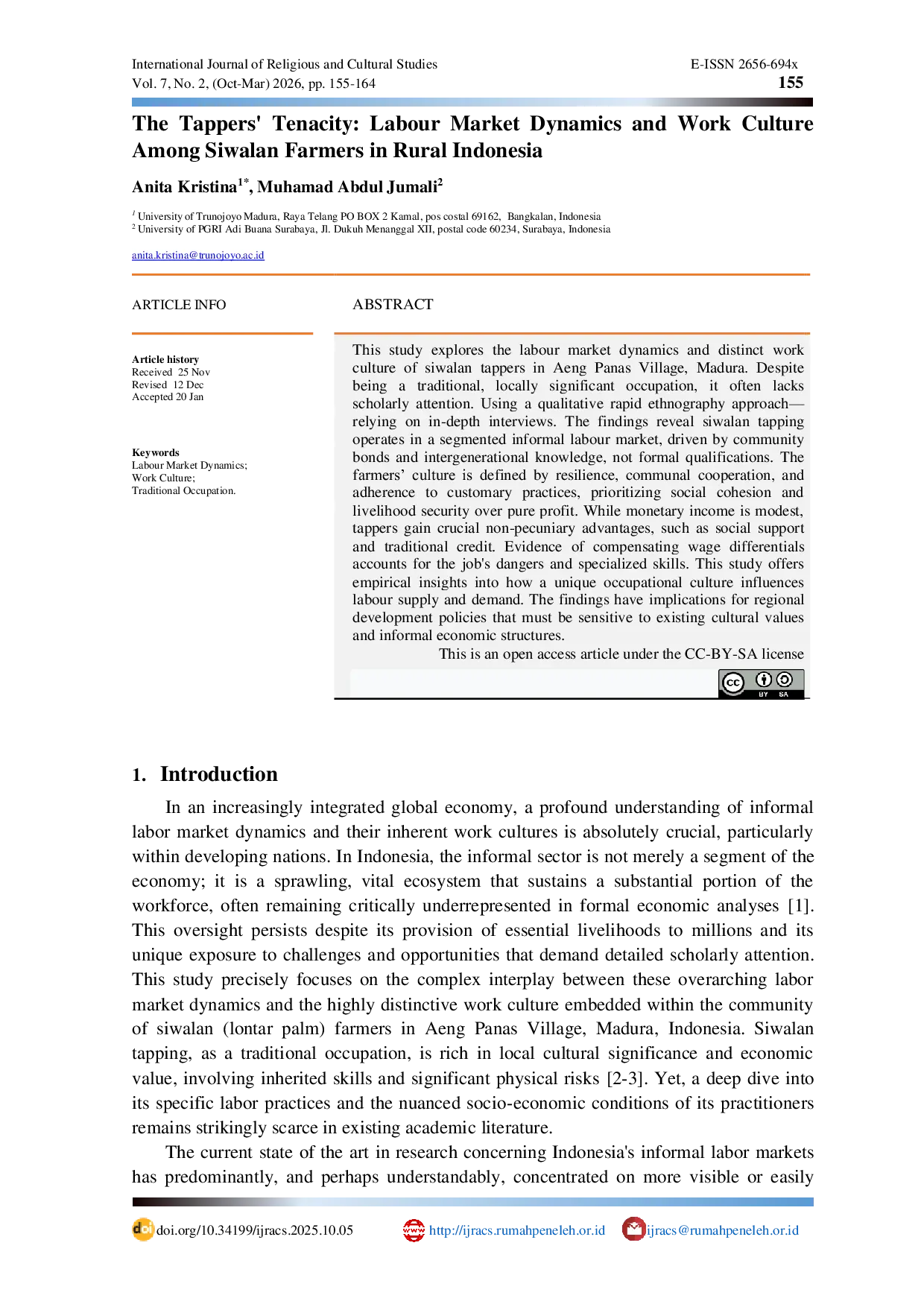 International Journal of Religious and Cultural StudiesInternational Journal of Religious and Cultural StudiesPenelitian ini mengeksplorasi dinamika pasar tenaga kerja dan budaya kerja yang khas pada petani penampi siwalan di Desa Aeng Panas, Madura. Meskipun merupakan pekerjaan tradisional yang penting secara lokal, bidang ini seringkali kurang mendapat perhatian ilmiah. Dengan pendekatan etnografi cepat kualitatif yang mengandalkan wawancara mendalam, temuan mengungkap bahwa penapisan siwalan beroperasi dalam pasar tenaga kerja informal yang tersegmentasi, didorong oleh ikatan komunitas dan pengetahuan antar‑generasi, bukan oleh kualifikasi formal. Budaya petani ditandai oleh ketahanan, gotong‑royong, dan kepatuhan pada praktik adat, yang memprioritaskan kohesi sosial dan keamanan mata pencaharian dibandingkan keuntungan materi semata. Pendapatan moneter bersifat modest, namun petani memperoleh keuntungan non‑moneter penting, seperti dukungan sosial dan kredit tradisional. Bukti adanya diferensial upah kompensasi mencerminkan bahaya pekerjaan dan keahlian khusus. Penelitian ini memberikan wawasan empiris tentang bagaimana budaya pekerjaan unik memengaruhi penawaran dan permintaan tenaga kerja, serta implikasinya bagi kebijakan pembangunan daerah yang harus sensitif terhadap nilai budaya dan struktur ekonomi informal yang ada.