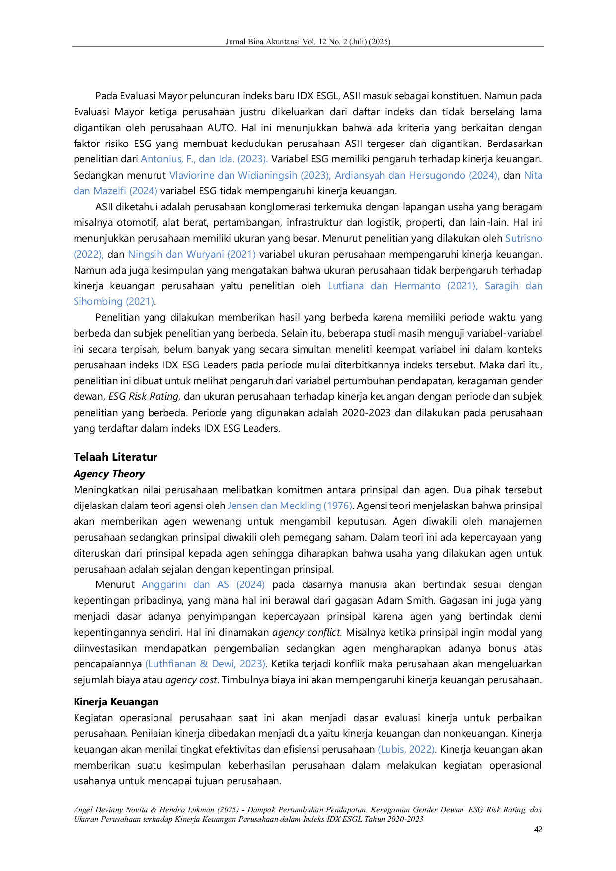 Jurnal Bina AkuntansiJurnal Bina AkuntansiSebagai suatu entitas, Perusahaan dinilai berdasarkan kinerja keuangan yang diperoleh. Kinerja keuangan perusahaan dipengaruhi oleh berbagai faktor. Penelitian ini menguji pengaruh pertumbuhan pendapatan, keragaman gender dewan, ESG risk rating, dan ukuran perusahaan terhadap kinerja keuangan perusahaan yang tergabung dalam indeks IDX ESG Leaders selama 2020–2023. Hasil penelitian menunjukkan bahwa variabel pertumbuhan pendapatan dan keragaman gender dewan tidak berpengaruh terhadap kinerja keuangan. Sedangkan variabel ESG Risk Rating berpengaruh positif terhadap kinerja keuangan dan variabel ukuran perusahaan berpengaruh negatif terhadap kinerja keuangan. Hasil ini memberikan masukan bagi manajemen perusahaan untuk lebih fokus pada pengelolaan biaya, kualitas dewan, risiko ESG, dan efisiensi operasional.