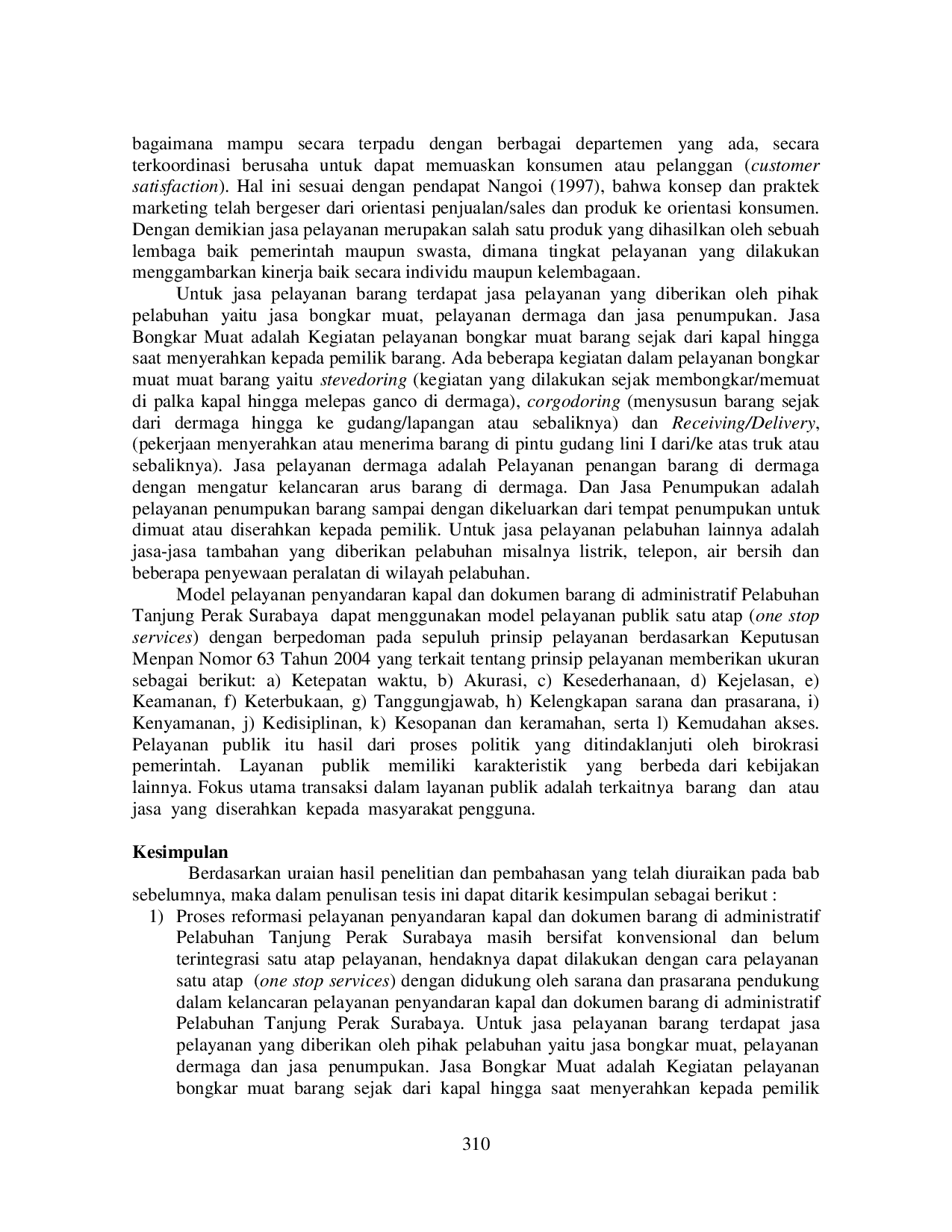 Penelitian ini menyimpulkan bahwa proses reformasi pelayanan penyandaran kapal dan dokumen barang di Administratif Pelabuhan Tanjung Perak Surabaya masih bersifat konvensional dan belum terintegrasi.Reformasi pelayanan dapat dilakukan dengan menerapkan model layanan satu atap (one stop services) yang didukung oleh fasilitas dan infrastruktur yang memadai.Penerapan model ini diharapkan dapat meningkatkan efisiensi dan kualitas pelayanan, serta memperlancar proses keluar masuk barang di pelabuhan.