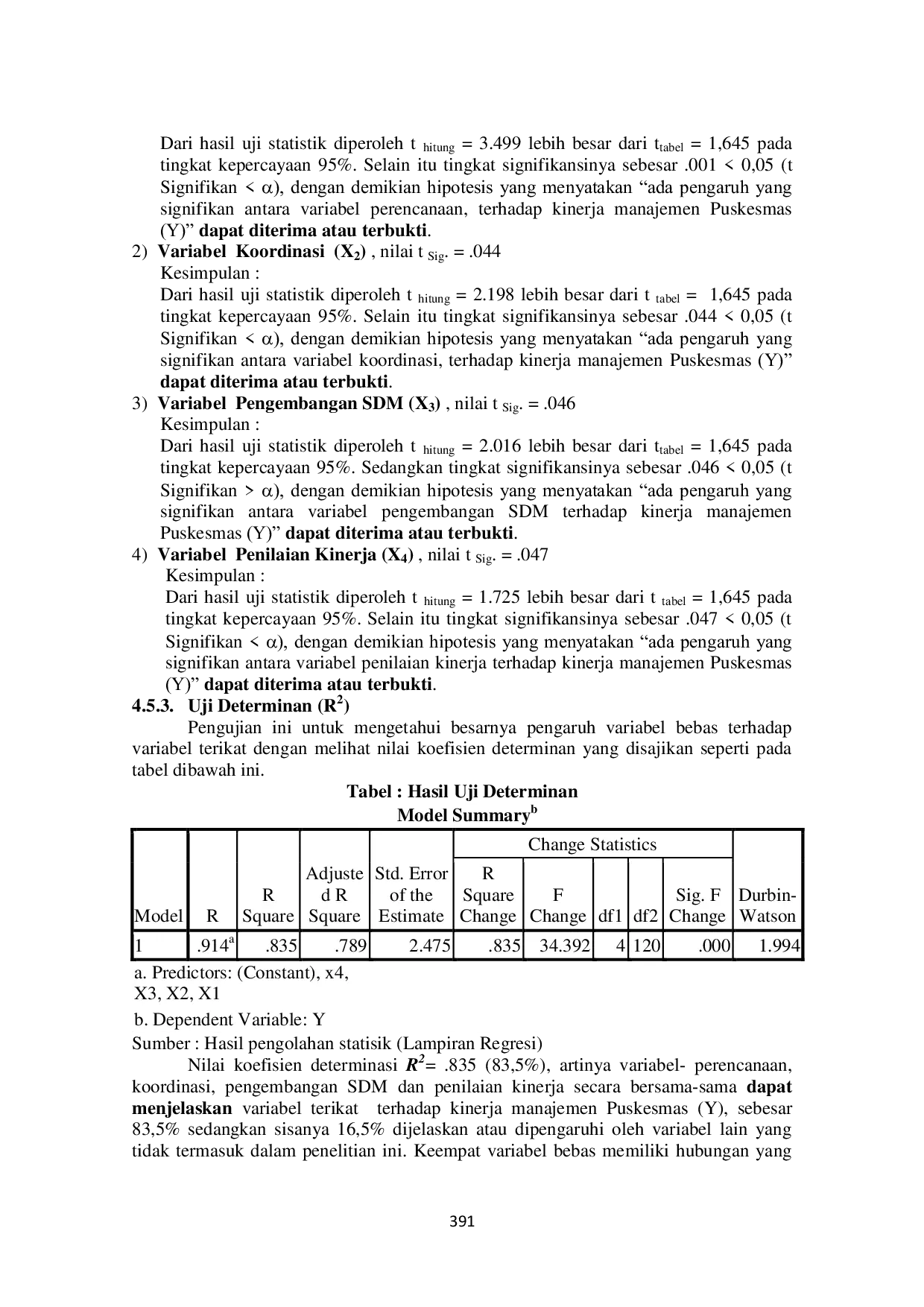 Penelitian ini menunjukkan bahwa perencanaan, koordinasi, pengembangan SDM, dan penilaian kinerja secara signifikan mempengaruhi kinerja manajemen puskesmas.Variabel perencanaan memiliki pengaruh dominan terhadap kinerja manajemen puskesmas.Oleh karena itu, untuk meningkatkan kinerja manajemen puskesmas, perlu dilakukan perencanaan yang baik di tingkat puskesmas, koordinasi antar puskesmas, pengembangan SDM, dan penilaian kinerja puskesmas.