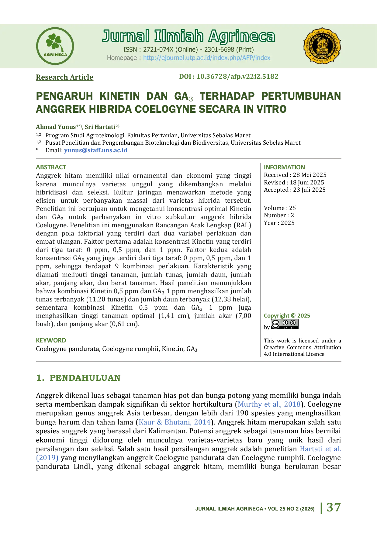 JURNAL ILMIAH AGRINECAJURNAL ILMIAH AGRINECAAnggrek hitam memiliki nilai ornamental dan ekonomi yang tinggi karena munculnya varietas unggul yang dikembangkan melalui hibridisasi dan seleksi. Kultur jaringan menawarkan metode yang efisien untuk perbanyakan massal dari varietas hibrida tersebut. Penelitian ini bertujuan untuk mengetahui konsentrasi optimal Kinetin dan GA₃ untuk perbanyakan in vitro subkultur anggrek hibrida Coelogyne. Penelitian ini menggunakan Rancangan Acak Lengkap (RAL) dengan pola faktorial yang terdiri dari dua variabel perlakuan dan empat ulangan. Faktor pertama adalah konsentrasi Kinetin yang terdiri dari tiga taraf: 0 ppm, 0,5 ppm, dan 1 ppm. Faktor kedua adalah konsentrasi GA₃ yang juga terdiri dari tiga taraf: 0 ppm, 0,5 ppm, dan 1 ppm, sehingga terdapat 9 kombinasi perlakuan. Karakteristik yang diamati meliputi tinggi tanaman, jumlah tunas, jumlah daun, jumlah akar, panjang akar, dan berat tanaman. Hasil penelitian menunjukkan bahwa kombinasi Kinetin 0,5 ppm dan GA₃ 1 ppm menghasilkan jumlah tunas terbanyak (11,20 tunas) dan jumlah daun terbanyak (12,38 helai), juga sementara kombinasi Kinetin 0,5 ppm dan GA₃ 1 ppm menghasilkan tinggi tanaman optimal (1,41 cm), jumlah akar (7,00 buah), dan panjang akar (0,61 cm).