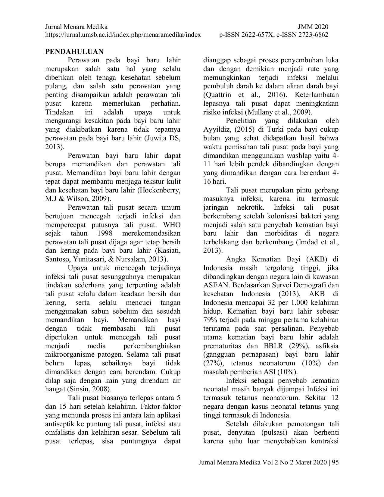 Menara MedikaMenara MedikaTali pusat merupakan pintu gerbang masuknya infeksi. Upaya untuk mencegah terjadinya infeksi tali pusat sesungguhnya merupakan tindakan sederhana yang terpenting adalah tali pusat selalu dalam keadaan bersih dan kering, serta selalu mencuci tangan menggunakan sabun sebelum dan sesudah memandikan bayi. Memandikan bayi dengan tidak membasahi tali pusat diperlukan untuk mencegah tali pusat menjadi media perkembangbiakan mikroorganisme patogen. Penelitian ini bertujuan untuk mengetahui efektifitas mandi kering (washlap) dalam mempercepat waktu pelepasan tali pusat. Penelitian ini bersifat kuantitatif dengan menggunakan desain penelitian quasy experiment with non equivalen control group design. Penelitian dilakukan pada bulan Juni tahun 2018 di Puskesmas Ciruas Kabupaten Serang Provinsi Banten. Teknik pengambilan sampel pada penelitian ini total sampling yaitu seluruh bayi yang lahir pada bulan Juni tahun 2018 sejumlah 40 bayi. Perbedaan kedua variabel dianalisis dengan menggunakan uji statistik t- test independent. Sebagian besar (65%) teknik memandikan bayi baru lahir yang digunakan orangtua bayi adalah teknik berendam. Rerata waktu pelepasan tali pusat pada bayi yang dimandikan dengan cara kering (washlap) yaitu 5,6 hari lebih cepat 1,5 hari dibanding bayi yang dimandikan dengan cara berendam (p=0,000). Teknik mandi kering (washlap) merupakan teknik memandikan bayi yang direkomendasikan untuk bayi baru lahir sampai dengan pelepasan tali pusat. Pemberi pelayanan kesehatan khususnya bidan perlu merekomendasikan teknik mandi kering (washlap) kepada orangtua bayi untuk mempercepat proses pelepasan tali pusat dan mencegah infeksi tali pusat.