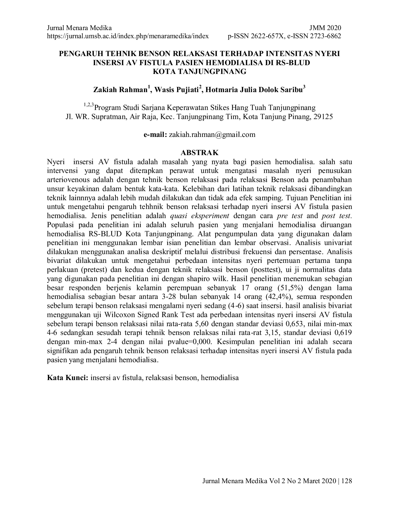Menara MedikaMenara MedikaNyeri insersi AV fistula adalah masalah yang nyata bagi pasien hemodialisa. Salah satu intervensi yang dapat diterapkan perawat untuk mengatasi masalah nyeri penusukan arteriovenous adalah dengan tehnik benson relaksasi pada relaksasi Benson ada penambahan unsur keyakinan dalam bentuk kata-kata. Kelebihan dari latihan teknik relaksasi dibandingkan teknik lainnya adalah lebih mudah dilakukan dan tidak ada efek samping. Tujuan Penelitian ini untuk mengetahui pengaruh tehhnik benson relaksasi terhadap nyeri insersi AV fistula pasien hemodialisa. Jenis penelitian adalah quasi eksperiment dengan cara pre test and post test.