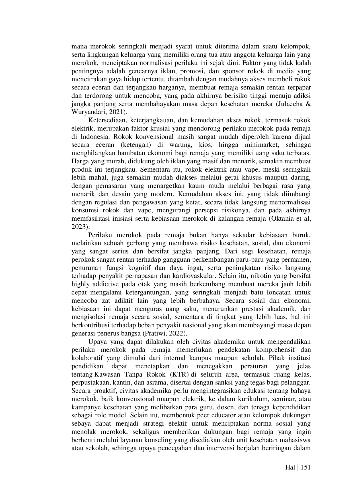 Untuk menekan angka perokok pemula di kalangan remaja, diperlukan pendekatan komprehensif yang melibatkan berbagai pihak. Pertama, institusi pendidikan dapat berperan aktif dalam mengedukasi bahaya merokok melalui kurikulum, seminar, atau kampanye kesehatan yang melibatkan guru, dosen, dan tenaga kependidikan sebagai role model. Selain itu, membentuk kelompok dukungan sebaya dapat menjadi strategi efektif untuk menciptakan norma sosial yang menolak merokok. Kedua, penguatan regulasi dan pengawasan terhadap peredaran rokok di lingkungan sekitar sekolah sangat penting untuk mencegah akses remaja terhadap rokok. Ketiga, penyediaan program pendampingan bagi remaja yang ingin berhenti merokok dapat membantu mereka dalam proses berhenti merokok dan mencegah relaps. Dengan kolaborasi antara sekolah, tenaga kesehatan, dan orang tua, serta dukungan dari komunitas remaja, diharapkan dapat menciptakan lingkungan yang mendukung perilaku hidup sehat tanpa rokok dan mengurangi dampak negatif merokok pada generasi muda.