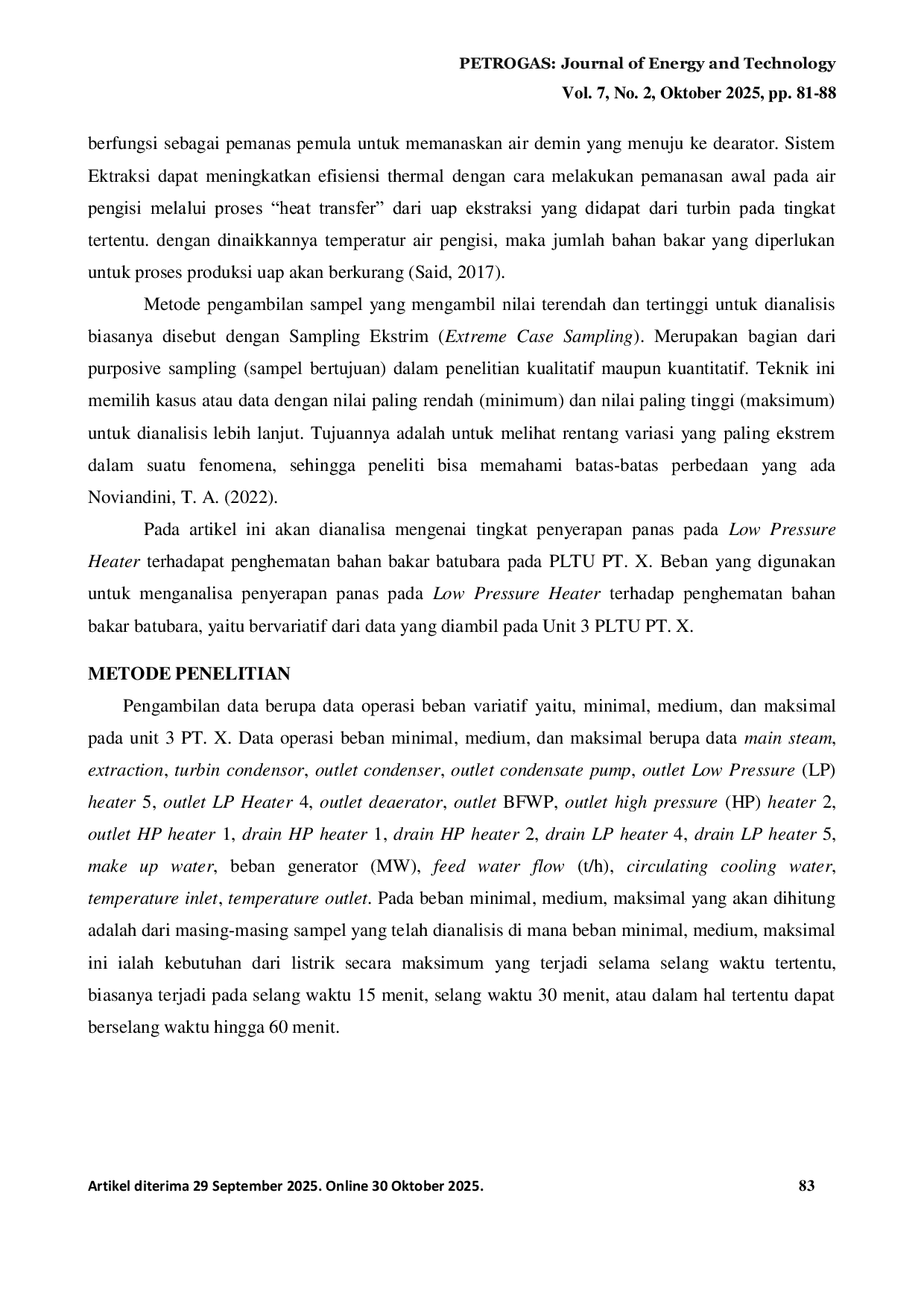 PETROGAS: Journal of Energy and TechnologyPETROGAS: Journal of Energy and TechnologyPemanfaatan energi listrik semakin meningkat seiring kemajuan ilmu pengetahuan, teknologi, dan pembangunan. Salah satu solusi untuk mengatasi krisis energi adalah dengan memanfaatkan sumber energi alternatif melalui pembangkit listrik. Penelitian ini menganalisis pengaruh tingkat penyerapan panas pada Low Pressure Heater (LPH) terhadap penghematan bahan bakar batubara di PLTU PT. X Unit 3 dengan variasi beban operasi minimal, medium, dan maksimal.