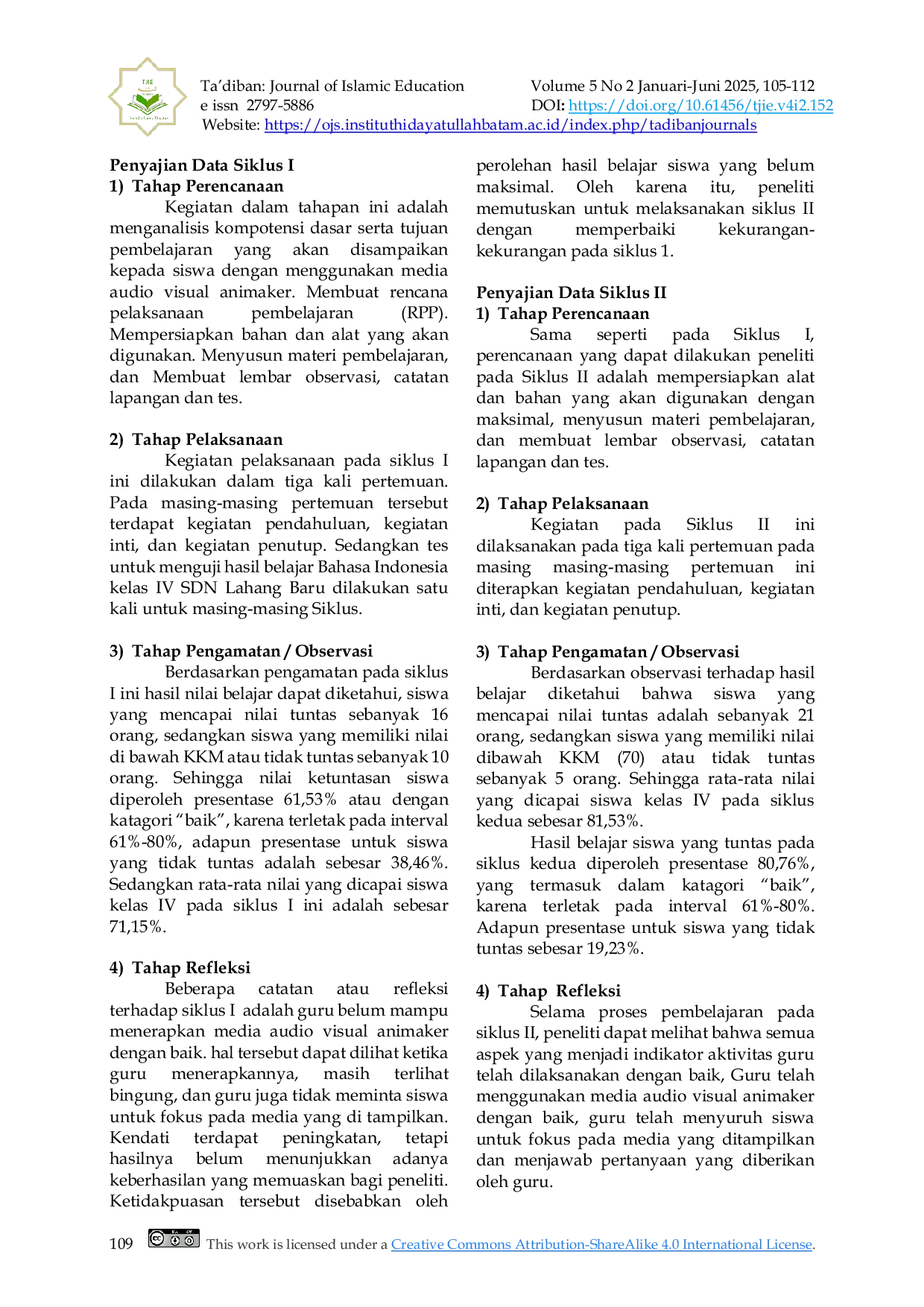 TA'DIBAN: Journal of Islamic EducationTA'DIBAN: Journal of Islamic EducationRendahnya hasil belajar siswa antara lain disebabkan oleh rasa bosan, tidak memperhatikan materi dan belum mampu menjelaskan materi yang diajarkan, dan tidak merespon pertanyaan guru. Tujuan yang ingin dicapai adalah untuk mengetahui penerapan media animaker dalam meningkatkan hasil belajar Bahasa Indonesia siswa di Sekolah Dasar. Penelitian Tindakan Kelas (PTK) Kemmis dan MC Tagart ini dilaksanakan 2 siklus masing-masing siklus terdiri dari 3 pertemuan dengan tahapan: perencanaan, pelaksanaan, pengamatan, dan refleksi. Subjek penelitiannya siswa kelas IV berjumlah 26 orang. Sedangkan objek penelitian adalah Media Animaker dan hasil belajar siswa. Hasil penelitian menunjukkan peningkatan dari 46,15% (cukup baik), meningkat menjadi 61,53% (baik), terakhir menjadi 80,76% (baik). Maka disimpulkan bahwa media animaker dapat meningkatkan hasil belajar siswa Sekolah Dasar.