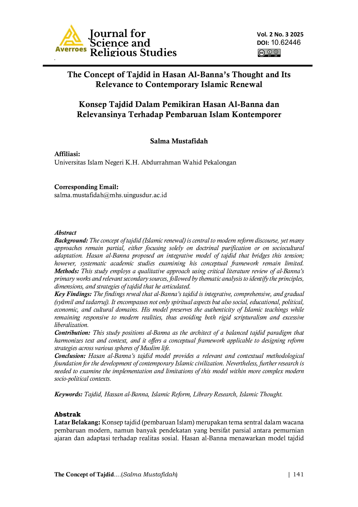 Averroes: Journal for Science and Religious StudiesAverroes: Journal for Science and Religious StudiesKonsep tajdid (pembaruan Islam) merupakan tema sentral dalam wacana pembaruan modern, namun banyak pendekatan yang bersifat parsial antara pemurnian ajaran dan adaptasi terhadap realitas sosial. Hasan al-Banna menawarkan model tajdid yang dinilai mampu menjembatani ketegangan tersebut, tetapi kajian akademik yang menelaah kerangka konseptualnya secara sistematis masih terbatas.