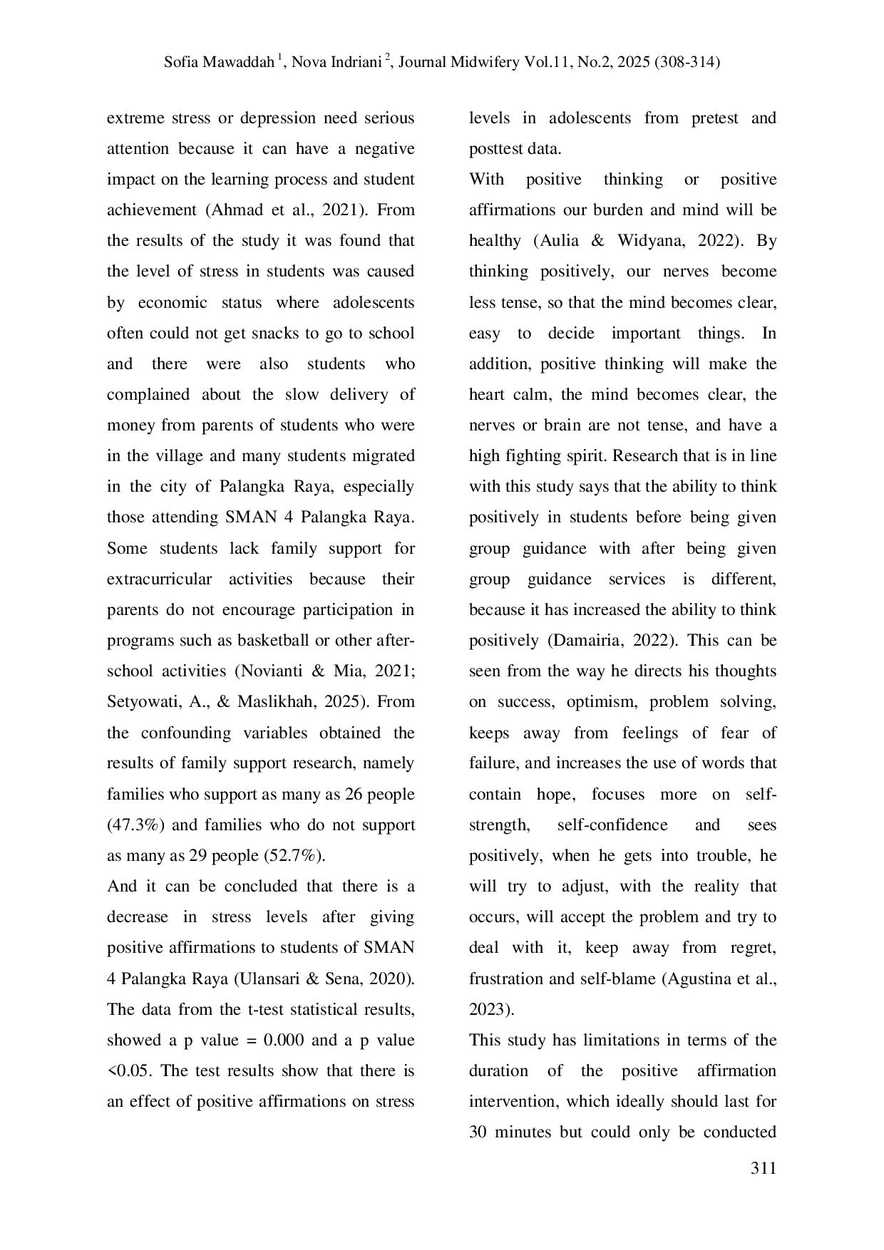 Berdasarkan hasil penelitian dengan total sampel 55 responden mengenai pengaruh pemberian afirmasi positif terhadap tingkat stres pada remaja di SMAN 4 Palangka Raya, dapat disimpulkan bahwa.Sebelum intervensi afirmasi positif, sebagian besar remaja mengalami tingkat stres sedang hingga berat.Setelah intervensi, mayoritas masuk ke kategori normal dan ringan, dengan penurunan signifikan pada tingkat stres sedang dan berat.Temuan ini mengkonfirmasi bahwa afirmasi positif dapat digunakan sebagai intervensi praktis dalam program sekolah untuk membantu remaja mengelola stres secara lebih efektif.
