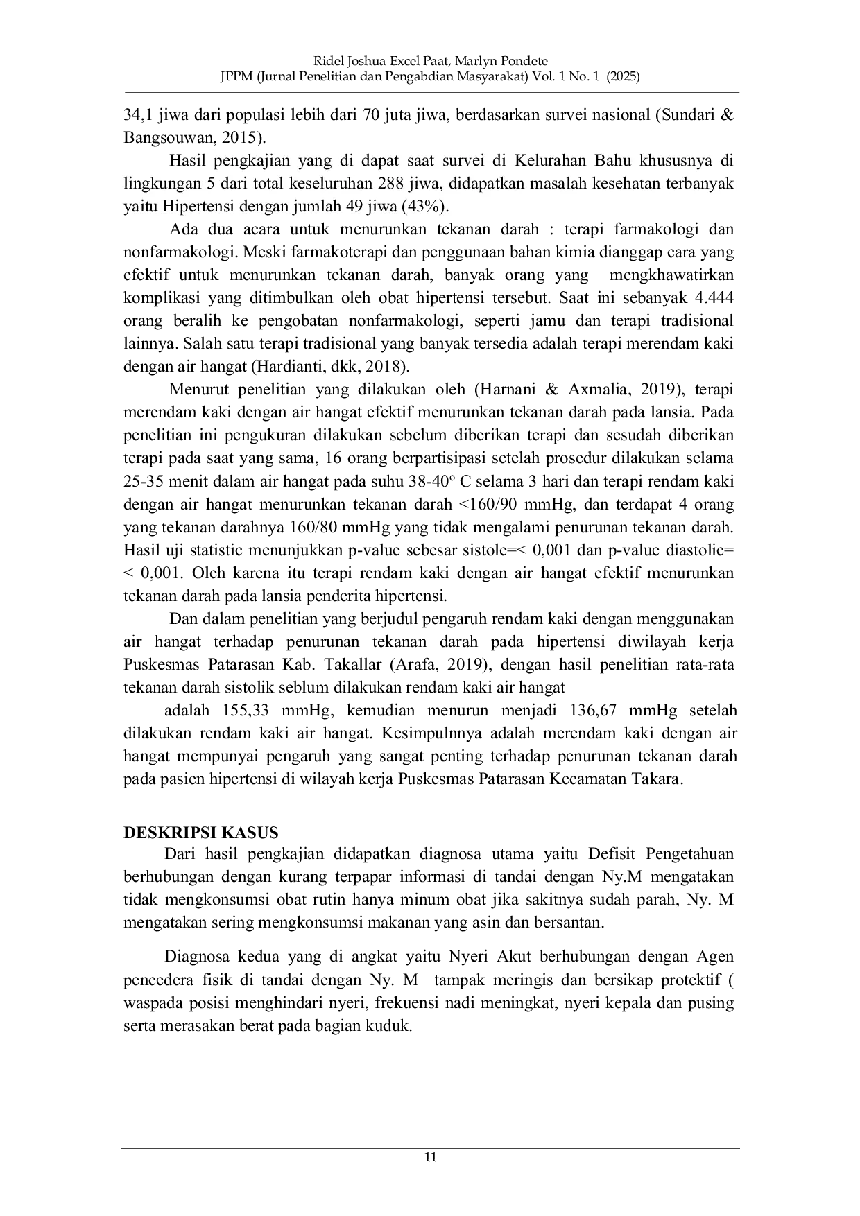 Jurnal Penelitian dan Pengabdian Masyarakat (JPPM)Jurnal Penelitian dan Pengabdian Masyarakat (JPPM)Hipertensi merupakan salah satu penyakit tidak menular yang menjadi masalah kesehatan yang serius. Pada umumnya terjadi tanpa gejala, sebagian besar orang tidak merasakan apapun walaupun tekanan darahnya sudah jauh di atas normal, maka hipertensi juga disebut sebagai pembunuh diam-diam atau silent killer. Penatalaksanaan pada hipertensi ini adalah melakukan terapi komplementer yaitu terapi rendam kaki dengan air hangat yang bertujuan untuk menurunkan tekanan darah. Metode dalam penulisan Karya Ilmiah Akhir Ners ini berupa studi kasus yang di ambil pada saat praktek komunitas di Kelurahan Bahu Kecamatan Malalayang Kota Manado dengan melakukan Asuhan Keperawatan selama 3 hari. Hasil yang didapatkan setelah melakukan intervensi terdapat adanya penurunan tekanan darah selama pemberian terapi komplementer yaitu rendam kaki dengan air hangat. Terjadi penurunan tekanan darah setelah dilakukan terapi komplementer dengan tekanan darah sebelum dilakukan terapi 183/100 mmHg dan setelah dilakukan terapi menjadi 120/80 mmHg. Dari penjelasan diatas dapat disimpulkan ada pengaruh yang signifikan dari pemberian terapi rendam kaki dengan air hangat terhadap penurunan tekanan darah. Disarankan kepada keluarga agar dapat menerapkan intervensi terapi komplementer merendam kaki dengan air hangat sebagai pengobatan nonfarmakologi dan dibantu juga oleh obat farmakologi yang didapat dari layanan kesehatan.