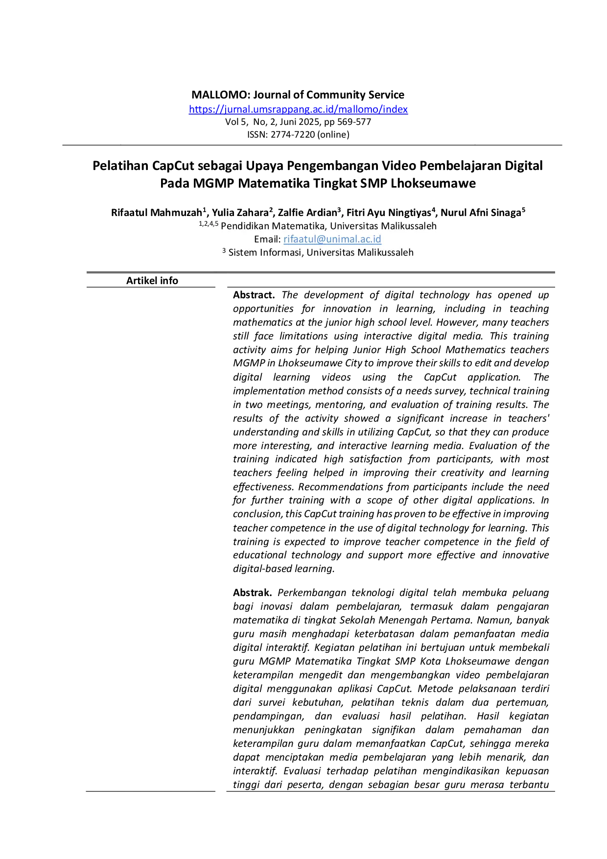 MALLOMO: Journal of Community ServiceMALLOMO: Journal of Community ServicePerkembangan teknologi digital telah membuka peluang bagi inovasi dalam pembelajaran, termasuk dalam pengajaran matematika di tingkat Sekolah Menengah Pertama. Namun, banyak guru masih menghadapi keterbatasan dalam pemanfaatan media digital interaktif. Kegiatan pelatihan ini bertujuan untuk membekali guru MGMP Matematika Tingkat SMP Kota Lhokseumawe dengan keterampilan mengedit dan mengembangkan video pembelajaran digital menggunakan aplikasi CapCut. Metode pelaksanaan terdiri dari survei kebutuhan, pelatihan teknis dalam dua pertemuan, pendampingan, dan evaluasi hasil pelatihan. Hasil kegiatan menunjukkan peningkatan signifikan dalam pemahaman dan keterampilan guru dalam memanfaatkan CapCut, sehingga mereka dapat menciptakan media pembelajaran yang lebih menarik dan interaktif. Evaluasi terhadap pelatihan mengindikasikan kepuasan tinggi dari peserta, dengan sebagian besar guru merasa terbantu dalam meningkatkan kreativitas dan efektivitas pembelajaran mereka. Rekomendasi dari peserta mencakup perlunya pelatihan lanjutan dengan cakupan aplikasi digital lainnya. Kesimpulannya, pelatihan CapCut ini terbukti efektif dalam meningkatkan kompetensi guru dalam pemanfaatan teknologi digital untuk pembelajaran.
