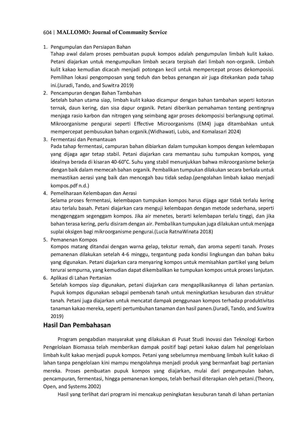 Untuk penelitian lanjutan, dapat dipertimbangkan studi yang fokus pada pengembangan teknologi pengomposan yang lebih efisien dan terjangkau bagi petani kecil. Selain itu, penelitian tentang dampak jangka panjang penggunaan pupuk kompos terhadap produktivitas tanaman kakao dan kesehatan tanah dapat memberikan wawasan lebih dalam. Terakhir, studi tentang strategi pemasaran dan distribusi pupuk kompos sebagai produk bernilai ekonomi dapat menjadi arah penelitian yang menarik untuk mendukung keberlanjutan program ini.