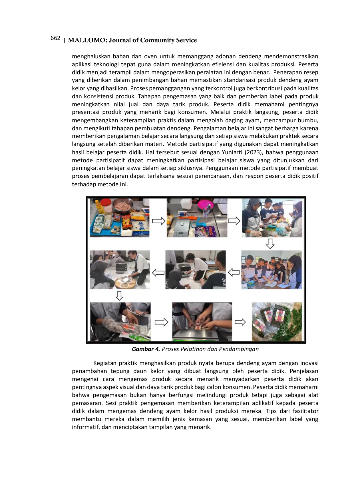 MALLOMO: Journal of Community ServiceMALLOMO: Journal of Community ServiceProyek pengabdian masyarakat ini bertujuan untuk meningkatkan pengetahuan dan keterampilan peserta didik SMKN 2 Sukoharjo dalam mengolah produk olahan daging ayam lokal dan menghasilkan produk pangan fungsional yang memiliki nilai jual tinggi. Kelor menjadi salah satu potensi lokal di lingkungan sekitar SMK N 2 Sukoharjo yang belum dimanfaatkan secara optimal sebagai tambahan bahan pangan bergizi. Dendeng daun kelor menjadi inovasi produk olahan ayam yang memiliki nilai gizi dan daya jual. Pelaksanaan kegiatan dilakukan melalui metode pelatihan dengan pendekatan praktik langsung dalam pembuatan dendeng ayam kelor. Hasil evaluasi menunjukkan peningkatan signifikan dari nilai pre-test ke post-test, dari 80,65% pada pre-test hingga 94,84% dan tingkat pengetahuan mitra mengalami peningkatan sebesar 14,19% yang menandakan bahwa peserta telah memahami dan mampu mengaplikasikan teknologi tepat guna dalam pembuatan produk tersebut. Kegiatan ini menyimpulkan bahwa penggunaan metode edukatif dan partisipatif terbukti efektif meningkatkan keterampilan praktis peserta didik sehingga mereka dapat menghasilkan produk nyata yang bernilai gizi lebih tinggi dan memiliki daya jual yang menarik.