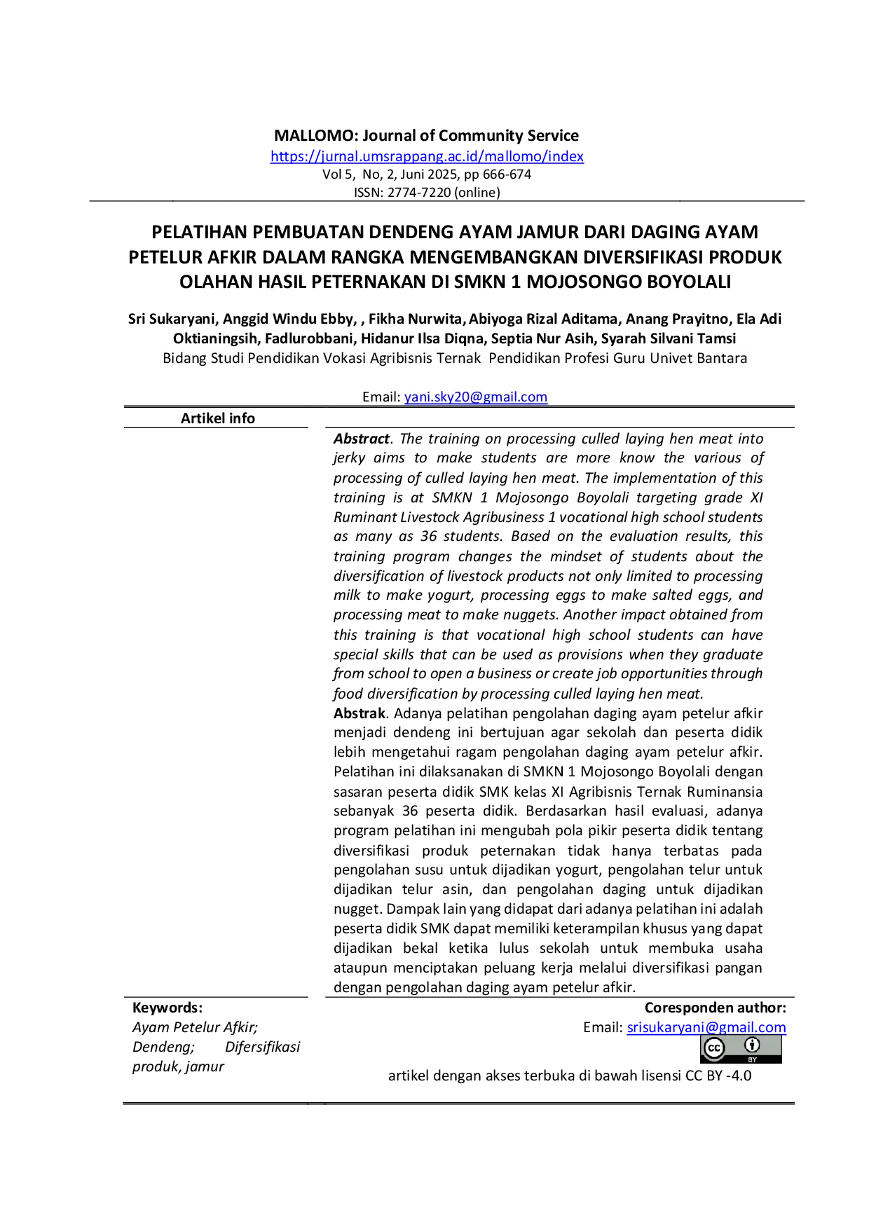 MALLOMO: Journal of Community ServiceMALLOMO: Journal of Community ServiceAdanya pelatihan pengolahan daging ayam petelur afkir menjadi dendeng ini bertujuan agar sekolah dan peserta didik lebih mengetahui ragam pengolahan daging ayam petelur afkir. Pelatihan ini dilaksanakan di SMKN 1 Mojosongo Boyolali dengan sasaran peserta didik SMK kelas XI Agribisnis Ternak Ruminansia sebanyak 36 peserta didik. Berdasarkan hasil evaluasi, adanya program pelatihan ini mengubah pola pikir peserta didik tentang diversifikasi produk peternakan tidak hanya terbatas pada pengolahan susu untuk dijadikan yogurt, pengolahan telur untuk dijadikan telur asin, dan pengolahan daging untuk dijadikan nugget. Dampak lain yang didapat dari adanya pelatihan ini adalah peserta didik SMK dapat memiliki keterampilan khusus yang dapat dijadikan bekal ketika lulus sekolah untuk membuka usaha ataupun menciptakan peluang kerja melalui diversifikasi pangan dengan pengolahan daging ayam petelur afkir.