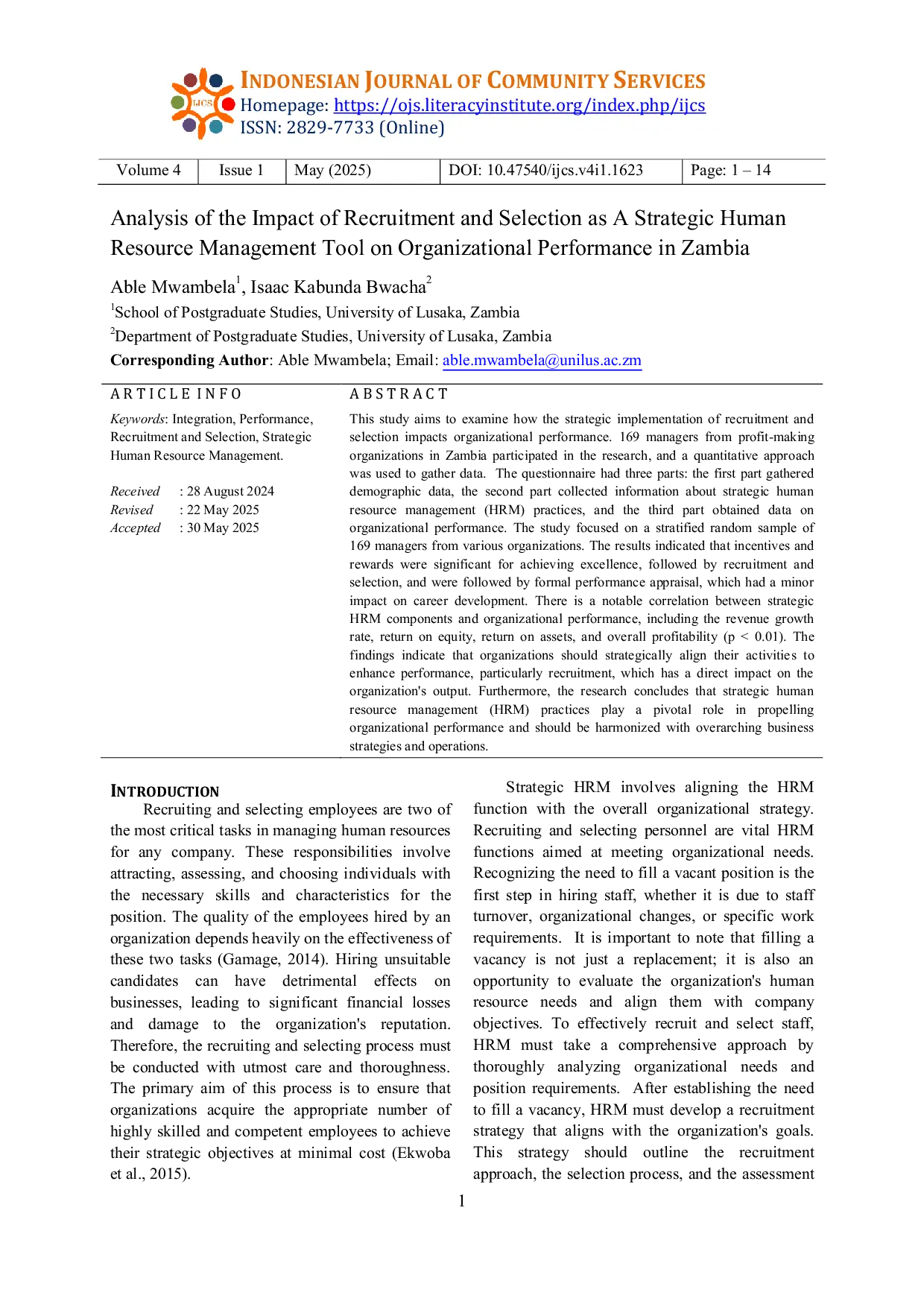 Indonesian Journal of Community ServicesIndonesian Journal of Community ServicesPenelitian ini bertujuan untuk menyelidiki bagaimana implementasi strategis dari rekrutmen dan seleksi mempengaruhi kinerja organisasi. Sebanyak 169 manajer dari organisasi profit di Zambia berpartisipasi dalam penelitian ini, dan pendekatan kuantitatif digunakan untuk mengumpulkan data. Kuesioner terdiri dari tiga bagian: bagian pertama mengumpulkan data demografis, bagian kedua mengumpulkan informasi tentang praktik manajemen sumber daya manusia (MSDM) strategis, dan bagian ketiga mengumpulkan data tentang kinerja organisasi. Penelitian ini berfokus pada sampel acak bertingkat 169 manajer dari berbagai organisasi. Hasil menunjukkan bahwa insentif dan penghargaan sangat penting untuk mencapai keunggulan, diikuti oleh rekrutmen dan seleksi, dan diikuti oleh penilaian kinerja formal, yang memiliki dampak kecil pada pengembangan karier. Ada korelasi yang signifikan antara komponen MSDM strategis dan kinerja organisasi, termasuk laju pertumbuhan pendapatan, return on equity, return on assets, dan profitabilitas keseluruhan (p < 0,01). Temuan menunjukkan bahwa organisasi harus secara strategis menyesuaikan aktivitas mereka untuk meningkatkan kinerja, terutama rekrutmen, yang memiliki dampak langsung pada output organisasi. Selain itu, penelitian ini menyimpulkan bahwa praktik MSDM strategis memainkan peran penting dalam mendorong kinerja organisasi dan harus diselaraskan dengan strategi bisnis dan operasi yang lebih luas.