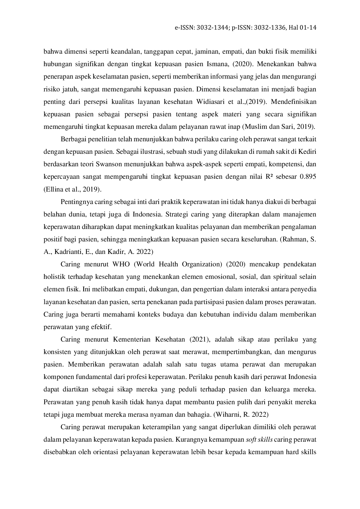 Untuk meningkatkan kualitas layanan keperawatan dan kepuasan pasien, disarankan kepada manajemen rumah sakit untuk terus meningkatkan kompetensi caring perawat melalui pelatihan, supervisi, dan evaluasi berkala. Selain itu, perlu dikembangkan sistem evaluasi layanan melalui mekanisme umpan balik pasien untuk memantau tingkat kepuasan sekaligus memastikan respons cepat terhadap keluhan. Saran penelitian lanjutan adalah mengeksplorasi faktor-faktor yang memoderasi hubungan antara caring perawat dan kepuasan pasien, seperti beban kerja perawat atau budaya organisasi. Manajemen rumah sakit juga dapat membuat sistem umpan balik real-time untuk memantau kepuasan pasien, terutama pada aspek keterlibatan emosional dan efektivitas komunikasi.