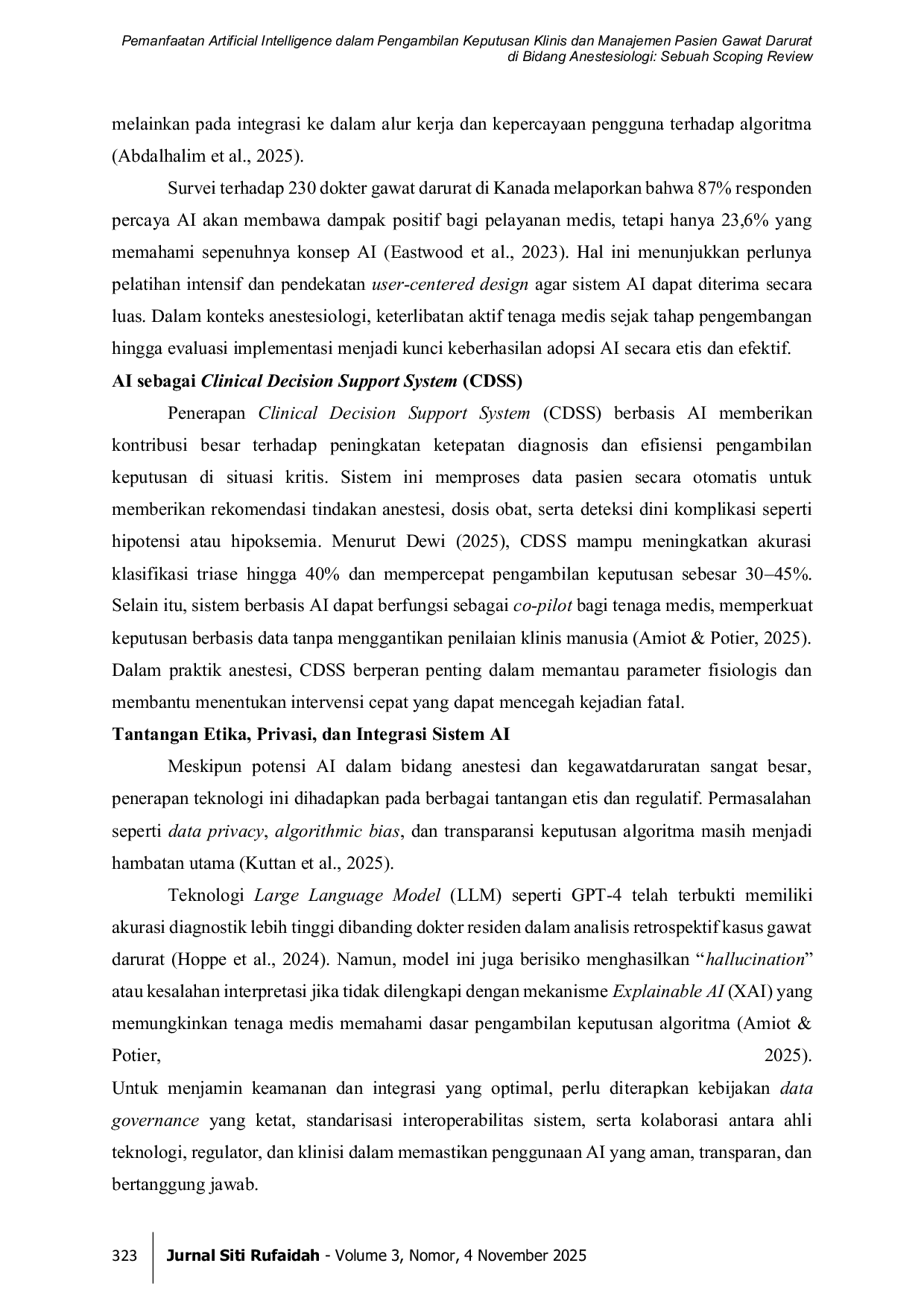 Jurnal Siti RufaidahJurnal Siti RufaidahAnestesiologi dan pelayanan gawat darurat menuntut keputusan yang cepat dan akurat. Artificial Intelligence (AI) berpotensi mendukung triase, pemantauan, dan pengambilan keputusan klinis pada situasi kritis. Scoping review ini memetakan pemanfaatan AI dalam pengambilan keputusan klinis dan manajemen pasien gawat darurat di bidang anestesiologi serta mengidentifikasi kesenjangan riset. Pencarian literatur dilakukan di ScienceDirect, PubMed, Cochrane Library, dan Google Scholar untuk artikel berbahasa Indonesia/Inggris terbit 2020–2025. Seleksi mengikuti kerangka Tricco dan kualitas dinilai dengan Joanna Briggs Institute (JBI). Sebanyak 10 artikel dianalisis. AI meningkatkan akurasi dan efisiensi triase (akurasi hingga 99,1% dan pemangkasan waktu tunggu sekitar 30%). Model machine learning mampu memprediksi kebutuhan perawatan kritis dan risiko kegawatdaruratan, sementara CDSS berbasis AI mempercepat dan memperbaiki kualitas keputusan klinis. Tantangan utama meliputi bias data, isu etika–privasi, kesiapan tenaga medis, dan integrasi sistem. AI dan CDSS berpotensi meningkatkan keselamatan pasien dan kualitas keputusan klinis pada anestesiologi gawat darurat. Diperlukan penguatan literasi AI, regulasi pendukung, dan pengembangan model yang transparan agar implementasi berjalan aman dan berkelanjutan.