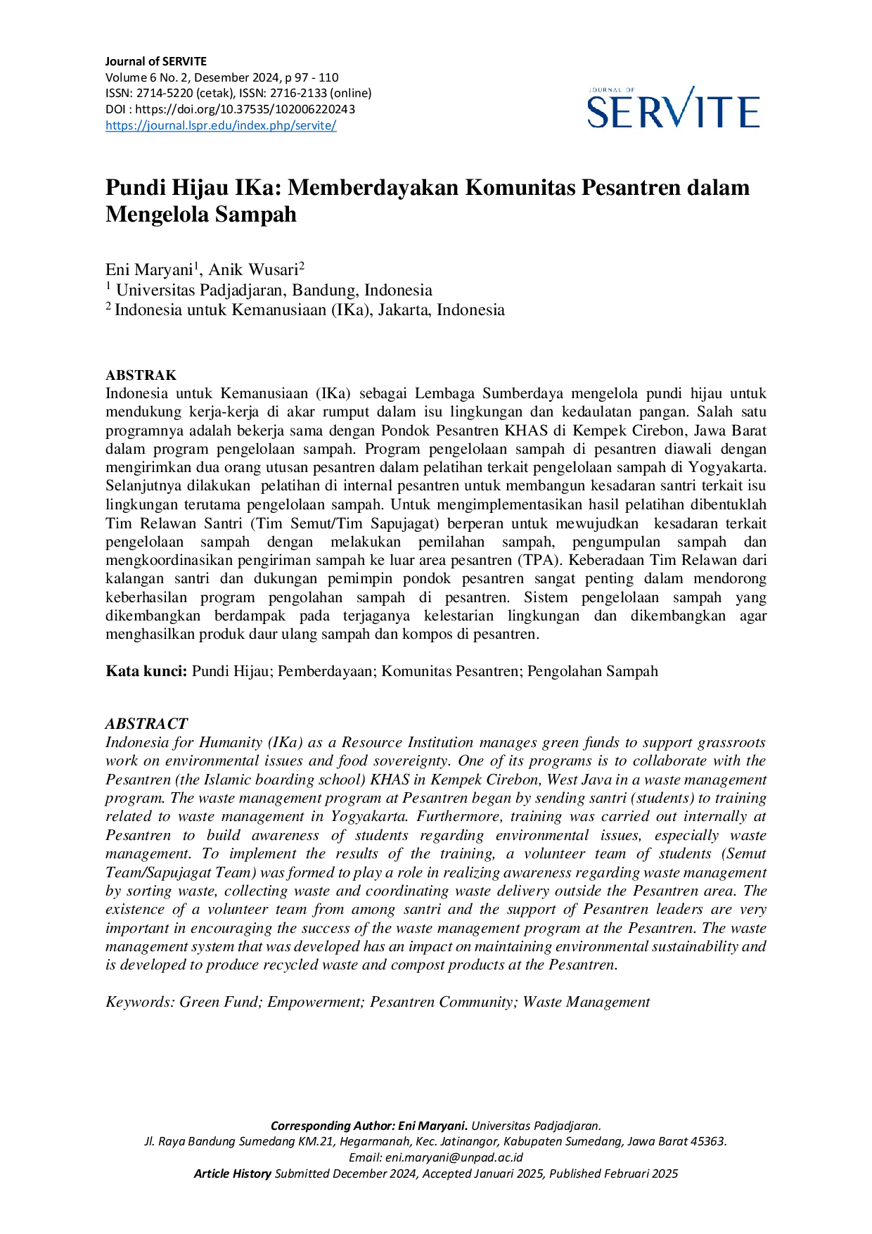 LSPR JournalLSPR JournalIndonesia untuk Kemanusiaan (IKa) sebagai Lembaga Sumberdaya mengelola pundi hijau untuk mendukung kerja-kerja di akar rumput dalam isu lingkungan dan kedaulatan pangan. Salah satu programnya adalah bekerja sama dengan Pondok Pesantren KHAS di Kempek Cirebon, Jawa Barat dalam program pengelolaan sampah. Program pengelolaan sampah di pesantren diawali dengan mengirim dua orang utusan pesantren dalam pelatihan terkait pengelolaan sampah di Yogyakarta. Selanjutnya dilakukan pelatihan di internal pesantren untuk membangun kesadaran santri terkait isu lingkungan terutama pengelolaan sampah. Untuk mengimplementasikan hasil pelatihan dibentuklah Tim Relawan Santri (Tim Semut/Tim Sapujagat) berperan untuk mewujudkan kesadaran terkait pengelolaan sampah dan mengkoordinasikan pengiriman sampah ke luar area pesantren (TPA). Keberadaan Tim Relawan dari kalangan santri dan dukungan pemimpin pondok pesantren sangat penting dalam mendorong keberhasilan program pengolahan sampah di pesantren. Sistem pengelolaan sampah yang dikembangkan berdampak pada lingkungan dan dikembangkan agar menghasilkan produk daur ulang sampah dan kompos di pesantren.