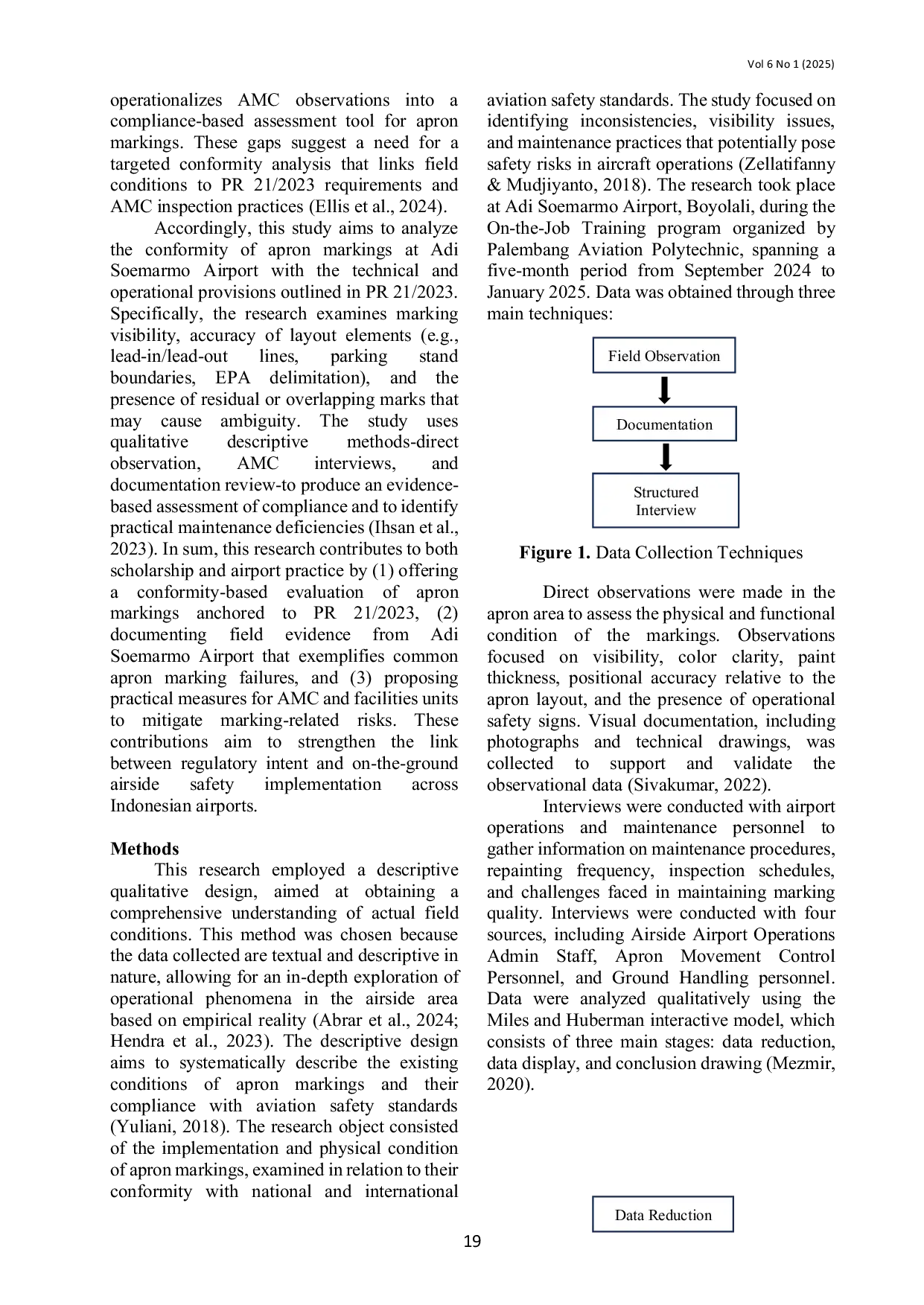 Journal of Airport Engineering Technology (JAET)Journal of Airport Engineering Technology (JAET)Based on observations at Adi Soemarmo Airport Boyolali, several apron markings were found to have faded or overlapped, particularly in areas that have undergone layout changes due to terminal development. These conditions reduce the visibility of the markings, potentially posing safety risks in the operation of aircraft and Ground Support Equipment (GSE) vehicles. This study aims to analyze the conformity of apron markings at Adi Soemarmo Airport with the technical provisions stipulated in the Minister of Transportation Regulation No. 21 of 2023. A qualitative descriptive method was applied through direct field observation, photographic documentation, comparison with regulatory specifications, and consultation with Apron Movement Control (AMC) officers to verify operational implications and maintenance practices. The results show that several marking elements, particularly stand boundaries, lead-in/lead-out lines, and equipment parking indications, do not fully meet visibility and standardization criteria as required by regulation, mainly due to color fading and misalignment from overlapping paint layers. These deficiencies reduce the effectiveness of the apron as a navigational aid and may elevate operational risk during peak activity. The novelty of this study lies in employing a regulatory compliance-based assessment specifically referencing PR 21 of 2023, which has not been explicitly adopted in previous apron marking evaluations. The findings contribute both theoretically, by demonstrating apron marking conformity as a measurable safety indicator, and practically, by offering evidence-based recommendations to strengthen AMC supervision and maintenance planning for airside safety enhancement.