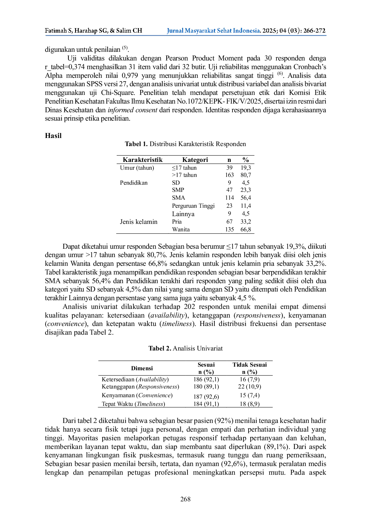 Jurnal Masyarakat Sehat IndonesiaJurnal Masyarakat Sehat IndonesiaSistem layanan kesehatan terkini menekankan kualitas pelayanan melalui pencapaian standar profesional dan pemanfaatan sumber daya yang efisien. Kepuasan pasien menjadi indikator penting yang berdampak tidak hanya pada individu pasien, tetapi juga pada reputasi dan keberlanjutan fasilitas kesehatan. Kepuasan pasien berdasarkan rasa puas yang dialami oleh pasien jika kinerja dari pelayanan kesehatan mempunyai hal yang melebihi harapan berdasarkan perasaan pasien. Tujuan penelitian ini untuk mengetahui dan mengetahui dimensi ketersediaan (availability), ketanggapan (responsiveness), kenyamanan (convenience), tepat waktu (timeliness) dengan kepuasan pasien di Puskesmas Kecamatan Sawah Besar.