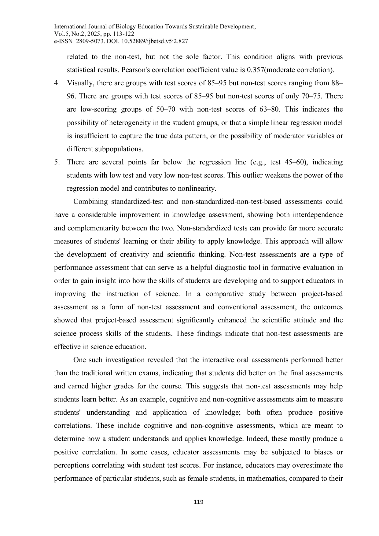 International Journal of Biology Education Towards Sustainable DevelopmentInternational Journal of Biology Education Towards Sustainable DevelopmentPenelitian ini bertujuan menguji korelasi antara hasil penilaian ujian dan non-ujian pada mahasiswa calon guru IPA kelas menengah yang mengikuti mata kuliah Struktur dan Fungsi Tumbuhan. Data diambil dari 131 mahasiswa. Hasil analisis menunjukkan korelasi positif dan signifikan antara skor ujian dan non-ujian (r = 0,357; p = 0,000), namun tidak menunjukkan hubungan kausal. Temuan ini menjadi referensi bagi pembuatan sistem evaluasi komprehensif dalam pendidikan sains.