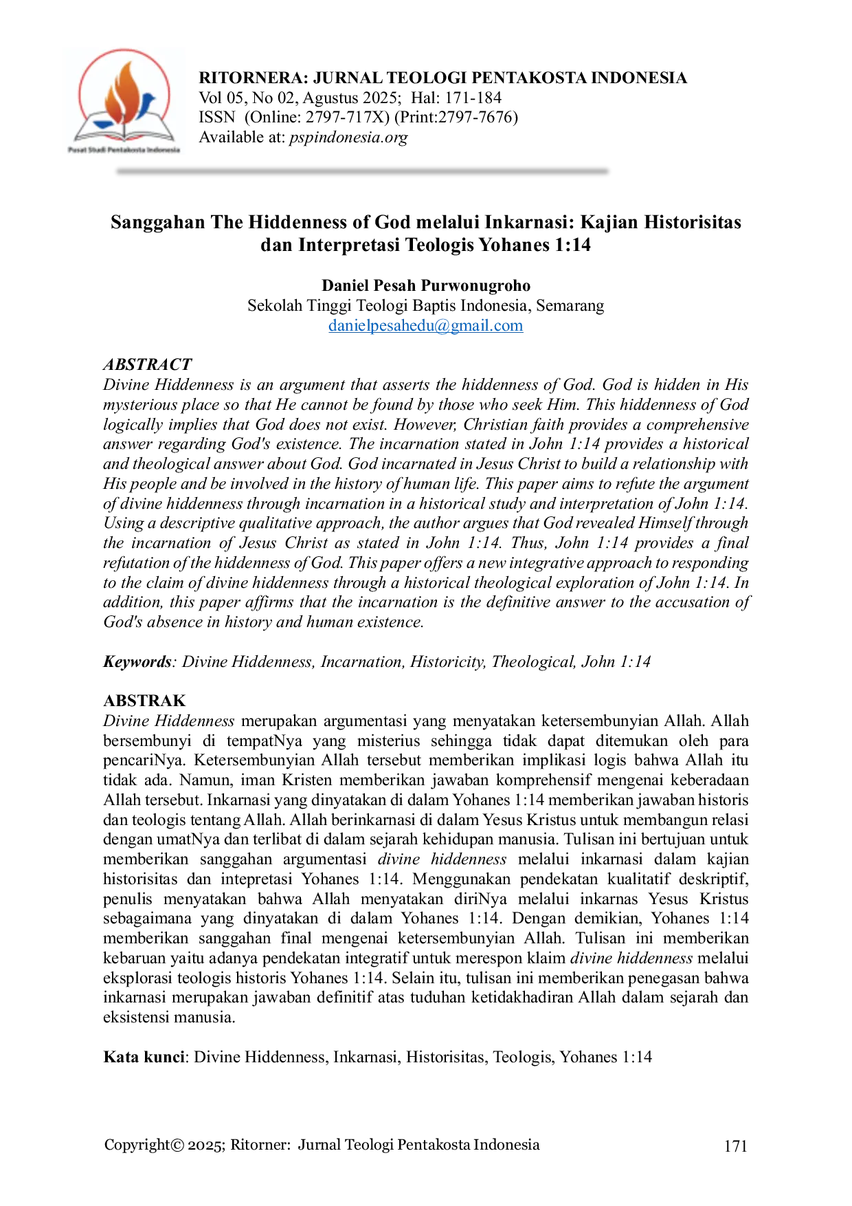 Ritornera - Jurnal Teologi Pentakosta IndonesiaRitornera - Jurnal Teologi Pentakosta IndonesiaDivine Hiddenness merupakan argumentasi yang menyatakan ketersembunyian Allah. Allah bersembunyi di tempatNya yang misterius sehingga tidak dapat ditemukan oleh para pencariNya. Ketersembunyian Allah tersebut memberikan implikasi logis bahwa Allah itu tidak ada. Namun, iman Kristen memberikan jawaban komprehensif mengenai keberadaan Allah tersebut. Inkarnasi yang dinyatakan di dalam Yohanes 1:14 memberikan jawaban historis dan teologis tentang Allah. Allah berinkarnasi di dalam Yesus Kristus untuk membangun relasi dengan umatNya dan terlibat di dalam sejarah kehidupan manusia. Tulisan ini bertujuan untuk memberikan sanggahan argumentasi divine hiddenness melalui inkarnasi dalam kajian historisitas dan intepretasi Yohanes 1:14. Menggunakan pendekatan kualitatif deskriptif, penulis menyatakan bahwa Allah menyatakan diriNya melalui inkarnas Yesus Kristus sebagaimana yang dinyatakan di dalam Yohanes 1:14. Dengan demikian, Yohanes 1:14 memberikan sanggahan final mengenai ketersembunyian Allah. Tulisan ini memberikan kebaruan yaitu adanya pendekatan integratif untuk merespon klaim divine hiddenness melalui eksplorasi teologis historis Yohanes 1:14. Selain itu, tulisan ini memberikan penegasan bahwa inkarnasi merupakan jawaban definitif atas tuduhan ketidakhadiran Allah dalam sejarah dan eksistensi manusia.