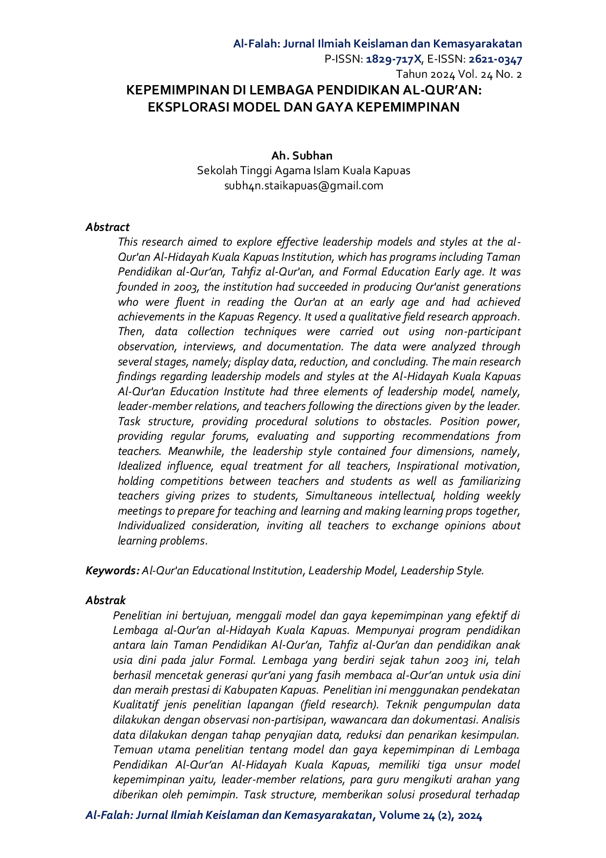 Al-Falah: Jurnal Ilmiah Keislaman dan KemasyarakatanAl-Falah: Jurnal Ilmiah Keislaman dan KemasyarakatanPenelitian ini bertujuan, menggali model dan gaya kepemimpinan yang efektif di Lembaga al-Quran al-Hidayah Kuala Kapuas. Mempunyai program pendidikan antara lain Taman Pendidikan Al-Quran, Tahfiz al-Quran dan pendidikan anak usia dini pada jalur Formal. Lembaga yang berdiri sejak tahun 2003 ini, telah berhasil mencetak generasi qurani yang fasih membaca al-Quran untuk usia dini dan meraih prestasi di Kabupaten Kapuas. Penelitian ini menggunakan pendekatan Kualitatif jenis penelitian lapangan (field research). Teknik pengumpulan data dilakukan dengan observasi non-partisipan, wawancara dan dokumentasi. Analisis data dilakukan dengan tahap penyajian data, reduksi dan penarikan kesimpulan. Temuan utama penelitian tentang model dan gaya kepemimpinan di Lembaga Pendidikan Al-Quran Al-Hidayah Kuala Kapuas, memiliki tiga unsur model kepemimpinan yaitu, leader-member relations, para guru mengikuti arahan yang diberikan oleh pemimpin. Task structure, memberikan solusi prosedural terhadap kendala. Position power yaitu, menyediakan forum rutinan, mengevaluasi dan mendukung rekomendasi dari guru. Adapun gaya kepemimpinan, memuat empat dimensi yaitu, Idealized influence, perlakuan sama untuk semua guru. Inspirastion motivation, mengadakan Lomba antar guru dan murid juga membiasakan guru memberikan hadiah bagi siswa, Intelectual simultan, Melaksanakan rapat mingguan untuk persiapan belajar-mengajar dan membuat learning props bersama, Individualized consideration, Mengajak semua guru bertukar pendapat tentang masalah pembelajaran.