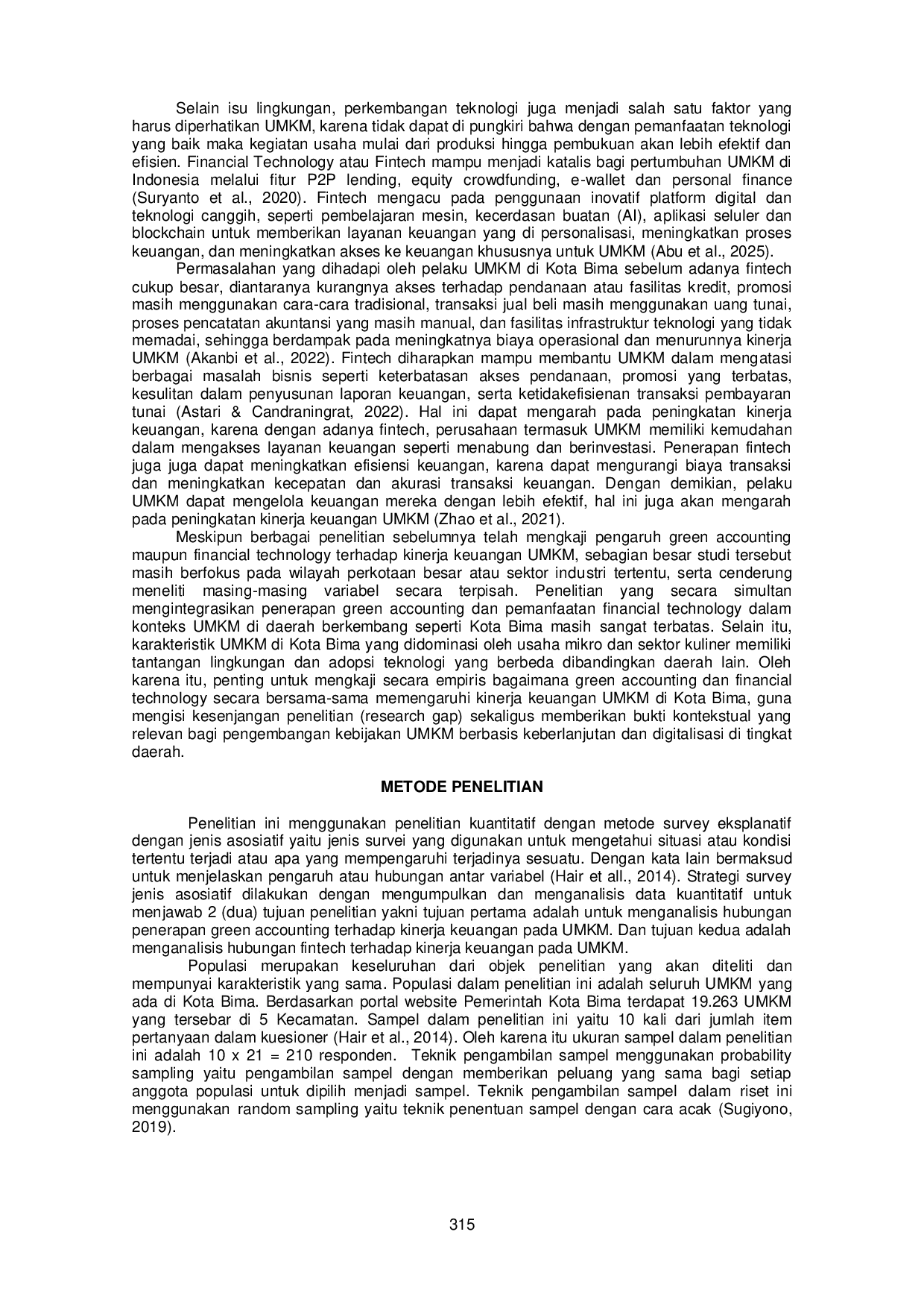 Penelitian ini bertujuan untuk menganalisis pengaruh Green Accounting dan Financial Technology terhadap kinerja keuangan UMKM di Kota Bima.Berdasarkan hasil analisis data menggunakan pendekatan Structural Equation Modeling–Partial Least Squares (SEM-PLS), diperoleh bukti empiris bahwa Green Accounting berpengaruh positif dan signifikan terhadap kinerja keuangan UMKM.Temuan ini menunjukkan bahwa penerapan praktik akuntansi hijau, seperti pengelolaan limbah, efisiensi penggunaan sumber daya, serta penggunaan kemasan ramah lingkungan, mampu meningkatkan efisiensi biaya operasional, memperkuat citra usaha, dan pada akhirnya berdampak pada peningkatan kinerja keuangan UMKM.Selain itu, hasil penelitian juga membuktikan bahwa Financial Technology berpengaruh positif dan signifikan terhadap kinerja keuangan UMKM.Pemanfaatan fintech, seperti pembayaran digital, akses pembiayaan berbasis teknologi, serta penggunaan platform digital dalam transaksi dan pencatatan keuangan, terbukti mampu meningkatkan efisiensi transaksi, memperluas jangkauan pasar, dan memperbaiki pengelolaan keuangan UMKM.Secara simultan, Green Accounting dan Financial Technology mampu menjelaskan 64,3% variasi kinerja keuangan UMKM, yang menegaskan bahwa integrasi praktik keberlanjutan lingkungan dan inovasi teknologi keuangan merupakan faktor strategis dalam meningkatkan kinerja UMKM di Kota Bima.
