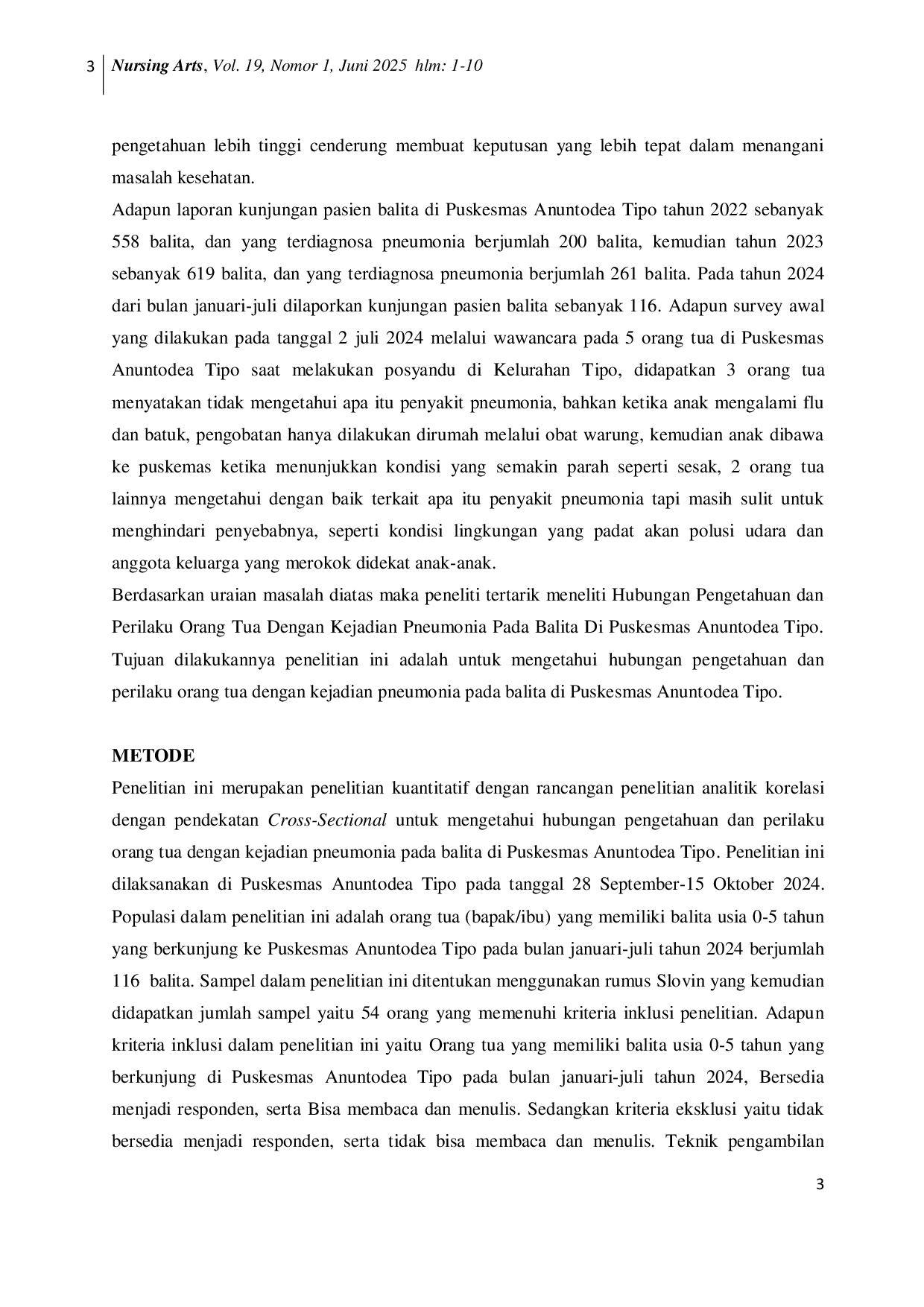 Nursing ArtsNursing ArtsPneumonia dikenal sebagai paru-paru basah yaitu penyakit infeksi pada kantung udara paru-paru akibat virus, bakteri, atau jamur. Berdasarkan Studi pendahuluan di Puskesmas Anuntodea Tipo menunjukkan bahwa dari 5 orang tua yang diwawancarai, 3 tidak mengetahui penyakit pneumonia, sedangkan 2 lainnya mengetahui dengan baik. Tujuan penelitian untuk mengetahui di Puskesmas Anuntodea Tipo. Metode Penelitian desain analitik korelasi dengan pendekatan cross-sectional. Sampel berjumlah 54 orang tua yang membawa anaknya berobat ke Puskesmas Anuntodea Tipo yang diambil dengan teknik purposive sampling. Instrumen penelitian menggunakan kuesioner. Analisa data menggunakan uji Kruskal Wallis. Hasil Penelitian menunjukkan nilai p-value= 0.003 <0.05 artinya ada hubungan pengetahuan orang tua dengan kejadian pneumonia dan nilai p-value= 0.000<0.05 artinya ada hubungan perilaku orang tua dengan kejadian pneumonia. Sehingga dapat disimpulkan terdapat di puskesmas Anuntodea Tipo.