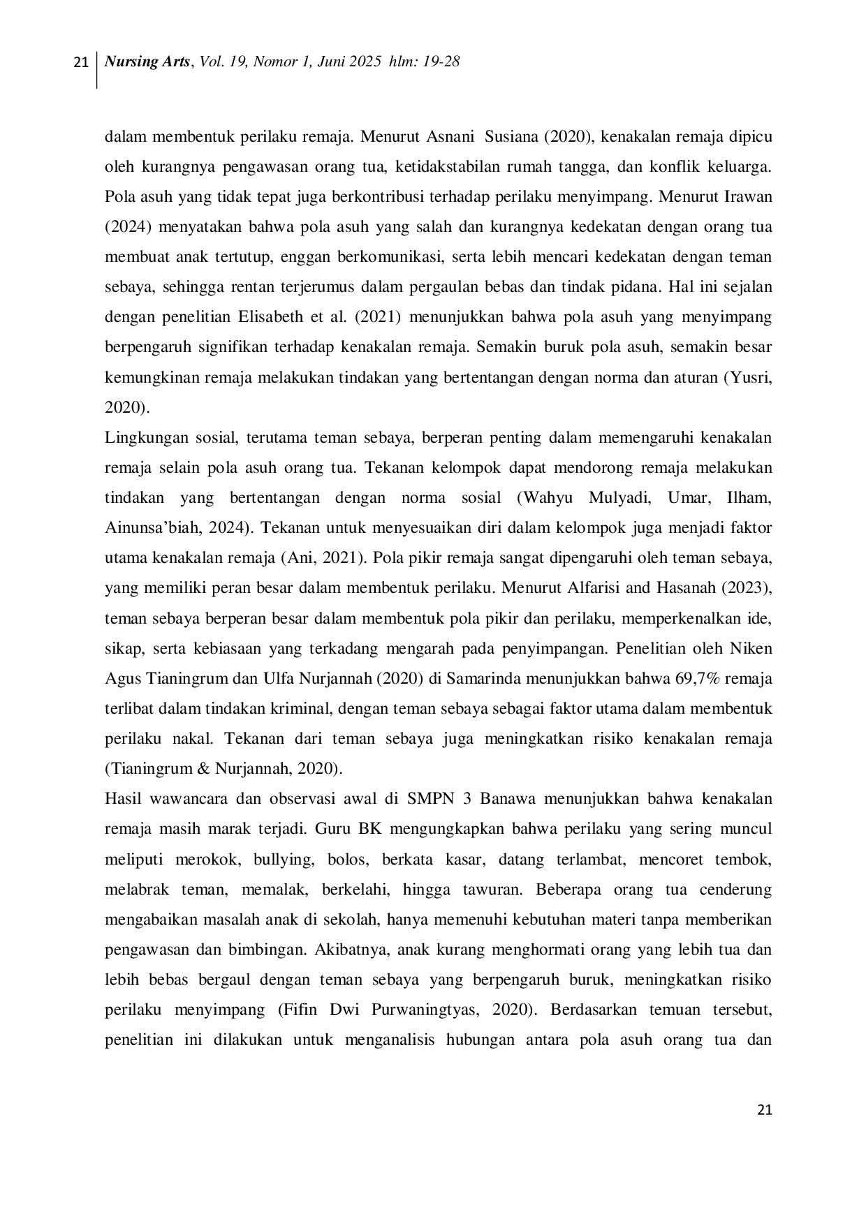 Nursing ArtsNursing ArtsMasa remaja adalah fase peralihan yang rentan terhadap kenakalan. Hasil observasi awal di SMPN 3 Banawa menunjukkan berbagai kasus seperti merokok, bullying, membolos, berkata kasar, dan tawuran, sementara beberapa orang tua cenderung mengabaikannya. Penelitian ini menganalisis hubungan pola asuh orang tua dan pergaulan teman sebaya dengan kenakalan remaja di SMPN 3 Banawa. Metode penelitian kuantitatif dengan desain cross-sectional, melibatkan 145 siswa kelas VIII dan IX yang dipilih menggunakan Stratified Proportional Random Sampling berdasarkan rumus Slovin. Hasil uji Chi-Square menunjukkan hubungan signifikan antara pola asuh orang tua (p = 0,007) dan pergaulan teman sebaya (p = 0,004) dengan kenakalan remaja. Kesimpulannya, pola asuh orang tua dan pergaulan teman sebaya berpengaruh terhadap kenakalan remaja di SMPN 3 Banawa. Disarankan siswa lebih selektif dalam pergaulan dan meningkatkan komunikasi dengan orang tua, keluarga, serta lingkungan untuk menekan angka kenakalan remaja.