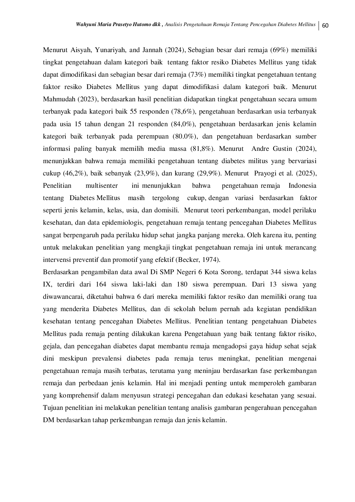 Berdasarkan hasil temuan bahwa remaja tengah merupakan kelompok usia yang paling dominan dengan tingkat pengetahuan tertinggi, serta adanya perbedaan tingkat pengetahuan berdasarkan jenis kelamin, maka disarankan untuk melakukan penelitian lebih lanjut mengenai faktor-faktor yang memengaruhi peningkatan pengetahuan pada remaja, khususnya perempuan.Selain itu, diperlukan pengembangan intervensi edukatif yang lebih efektif dan spesifik bagi remaja laki-laki, guna meningkatkan pemahaman mereka terkait pencegahan diabetes melitus sejak dini.