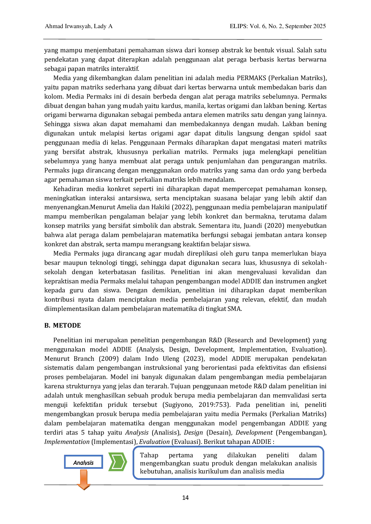 ELIPS: Jurnal Pendidikan MatematikaELIPS: Jurnal Pendidikan MatematikaPenelitian ini bertujuan untuk mengembangkan media pembelajaran PERMAKS (Perkalian Matriks), yaitu papan matriks dari kertas origami (berwarna) untuk mempermudah pemahaman siswa terhadap operasi perkalian matriks. Penelitian ini dilaksanakan di kelas XI SMA Muhammadiyah 1 Rambipuji menggunakan model pengembangan ADDIE (Analysis, Design, Development, Implementation, Evaluation). Media PERMAKS divalidasi oleh ahli materi dan ahli media, serta diuji kepraktisannya melalui angket guru dan siswa. Hasil validasi menunjukkan media sangat valid (skor rata-rata 3,72), dan hasil kepraktisan menunjukkan media mudah digunakan dan menarik (skor rata-rata 3,63). Hasil observasi juga menunjukkan peningkatan keterlibatan siswa selama pembelajaran. Media pembelajaran ini memiliki efek potensial dari hasil belajar siswa dengan presentase ketuntasan siswa sebesar 79,5 dengan kategori Baik. Media ini efektif meningkatkan pemahaman siswa terhadap materi matriks secara konkret dan menyenangkan.