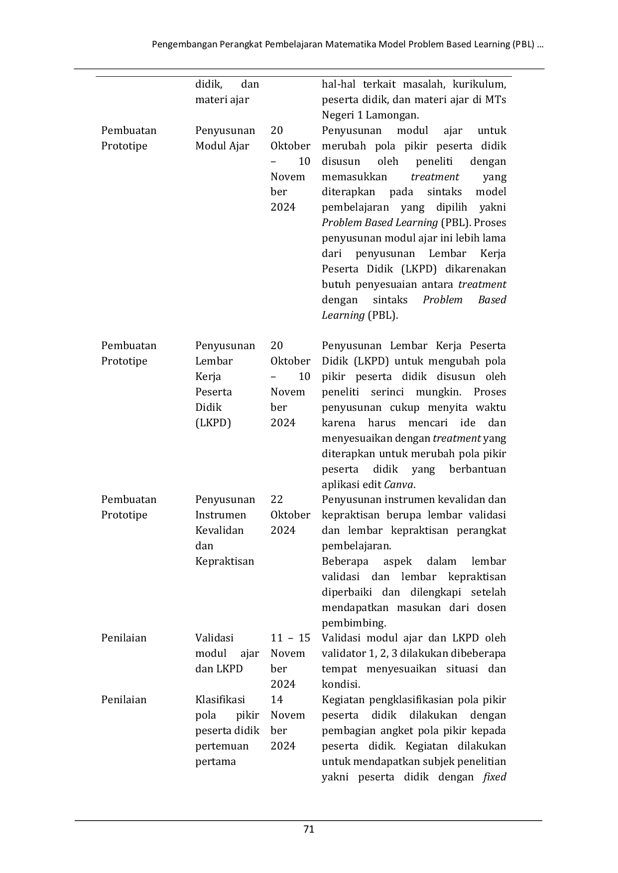 ELIPS: Jurnal Pendidikan MatematikaELIPS: Jurnal Pendidikan MatematikaPola pikir perlu diperhatikan karena sangat berpengaruh terhadap kemampuan pemecahan masalah serta tingkat keberhasilan matematika peserta didik. Terdapat dua jenis pola pikir, yakni pola pikir tetap (fixed mindset) dan pola pikir berkembang (growth mindset). Penelitian ini mengembangkan perangkat pembelajaran matematika model Problem Based Learning (PBL) untuk mengubah pola pikir peserta didik. Perangkat pembelajaran yang dikembangkan terdiri dari modul ajar dan Lembar Kerja Peserta Didik (LKPD). Tujuan penelitian ialah untuk mendeskripsikan proses pengembangan, kevalidan, kepraktisan, dan keefektifan perangkat pembelajaran matematika model Problem Based Learning (PBL) untuk mengubah pola pikir peserta didik. Penelitian merupakan pengembangan yang dilaksanakan di kelas VII-I MTs Negeri 1 Lamongan pada semester ganjil tahun ajaran 2024/2025. Subjek penelitian dipilih menggunakan teknik purposive sampling dengan tujuan memperoleh peserta didik dengan fixed mindset. Penelitian dikembangkan menggunakan model pengembangan Plomp yang terdiri dari tiga fase, yakni fase investigasi awal, pembuatan prototipe, dan penilaian. Teknik pengumpulan data yang digunakan ialah teknik catatan lapangan, teknik validasi dan kepraktisan serta teknik angket pola pikir peserta didik. Hasil penelitian menunjukkan bahwa pada fase investigasi awal telah dilakukan analisis masalah, kurikulum, karakteristik peserta didik dan materi ajar. Perangkat pembelajaran disusun pada fase pembuatan prototipe. Pada fase penilaian, perangkat pembelajaran dinilai dan divalidasi serta diujicobakan. Modul ajar dan Lembar Kerja Peserta Didik (LKPD) memiliki tingkat validitas “sangat tinggi dengan nilai rata-rata kevalidan modul ajar sebesar 0,9 dan nilai rata-rata kevalidan LKPD sebesar 0,8. Modul ajar dan Lembar Kerja Peserta Didik (LKPD) juga memiliki tingkat kepraktisan “sangat tinggi dengan nilai rata-rata kepraktisan modul ajar sebesar 0,8 dan nilai rata-rata kepraktisan LKPD sebesar 0,8. Keefektifan perangkat pembelajaran dikatakan efektif berdasarkan hasil penelitian yang menunjukkan angka keefektifan sebesar 85,71%.