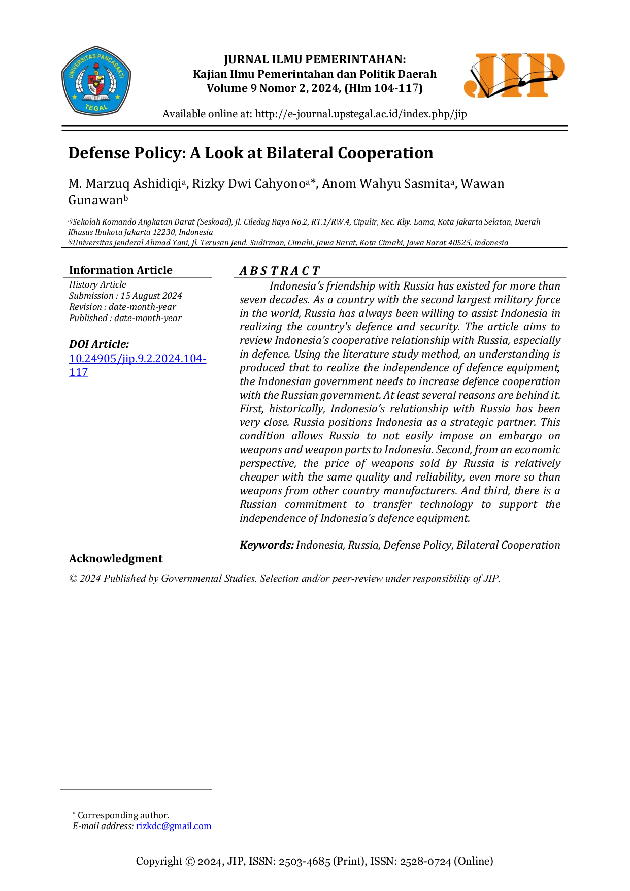 Jurnal Ilmu Pemerintahan : Kajian Ilmu Pemerintahan dan Politik DaerahJurnal Ilmu Pemerintahan : Kajian Ilmu Pemerintahan dan Politik DaerahPersahabatan Indonesia dengan Rusia telah ada selama lebih dari tujuh dekade. Sebagai negara dengan kekuatan militer terbesar kedua di dunia, Rusia selalu bersedia membantu Indonesia dalam mewujudkan pertahanan dan keamanan negara. Artikel ini bertujuan untuk meninjau hubungan kerjasama Indonesia dengan Rusia, khususnya dalam bidang pertahanan. Dengan menggunakan metode studi literatur, dihasilkan pemahaman bahwa untuk mewujudkan kemandirian peralatan pertahanan, pemerintah Indonesia perlu meningkatkan kerjasama pertahanan dengan pemerintah Rusia. Setidaknya ada beberapa alasan di balik hal ini. Pertama, secara historis, hubungan Indonesia dengan Rusia sangat dekat. Rusia memposisikan Indonesia sebagai mitra strategis. Kondisi ini memungkinkan Rusia untuk tidak dengan mudah memberlakukan embargo senjata dan suku cadang senjata ke Indonesia. Kedua, dari perspektif ekonomi, harga senjata yang dijual oleh Rusia relatif lebih murah dengan kualitas dan keandalan yang sama, bahkan lebih baik daripada senjata dari produsen negara lain. Dan ketiga, ada komitmen Rusia untuk mentransfer teknologi untuk mendukung kemandirian peralatan pertahanan Indonesia.