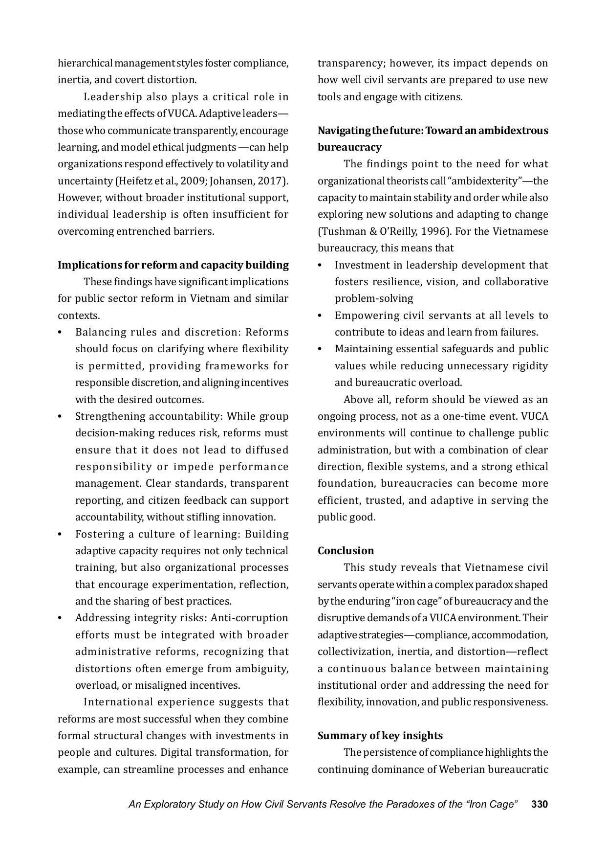 Policy & Governance ReviewPolicy & Governance ReviewThis study explores how Vietnamese civil servants address the complex paradoxes created by the “iron cage of bureaucracy, particularly within the volatile, uncertain, complex, and ambiguous (VUCA) environment of modern public administration. Using in-depth qualitative interviews with 30 public officials from diverse regions and roles, this study uncovered a nuanced spectrum of adaptive strategies, including compliance, accommodation, collectivization, inertia, and distortion. By integrating classical and contemporary bureaucracy theories with real-world accounts, this study highlights how traditional hierarchical cultures and rigid procedures simultaneously support stability and impede effective adaptation. Comparative analysis of global and regional public sector reforms reveals both the unique and shared dilemmas faced by Vietnamese officials. The findings have significant implications for policy reforms, organizational change, and future research on state capacity, accountability, and innovation in developing countries. This paper argues that successful bureaucratic adaptation in a VUCA world requires balancing institutional orders with responsible discretion and fostering a culture of learning, resilience, and ethical public services.
