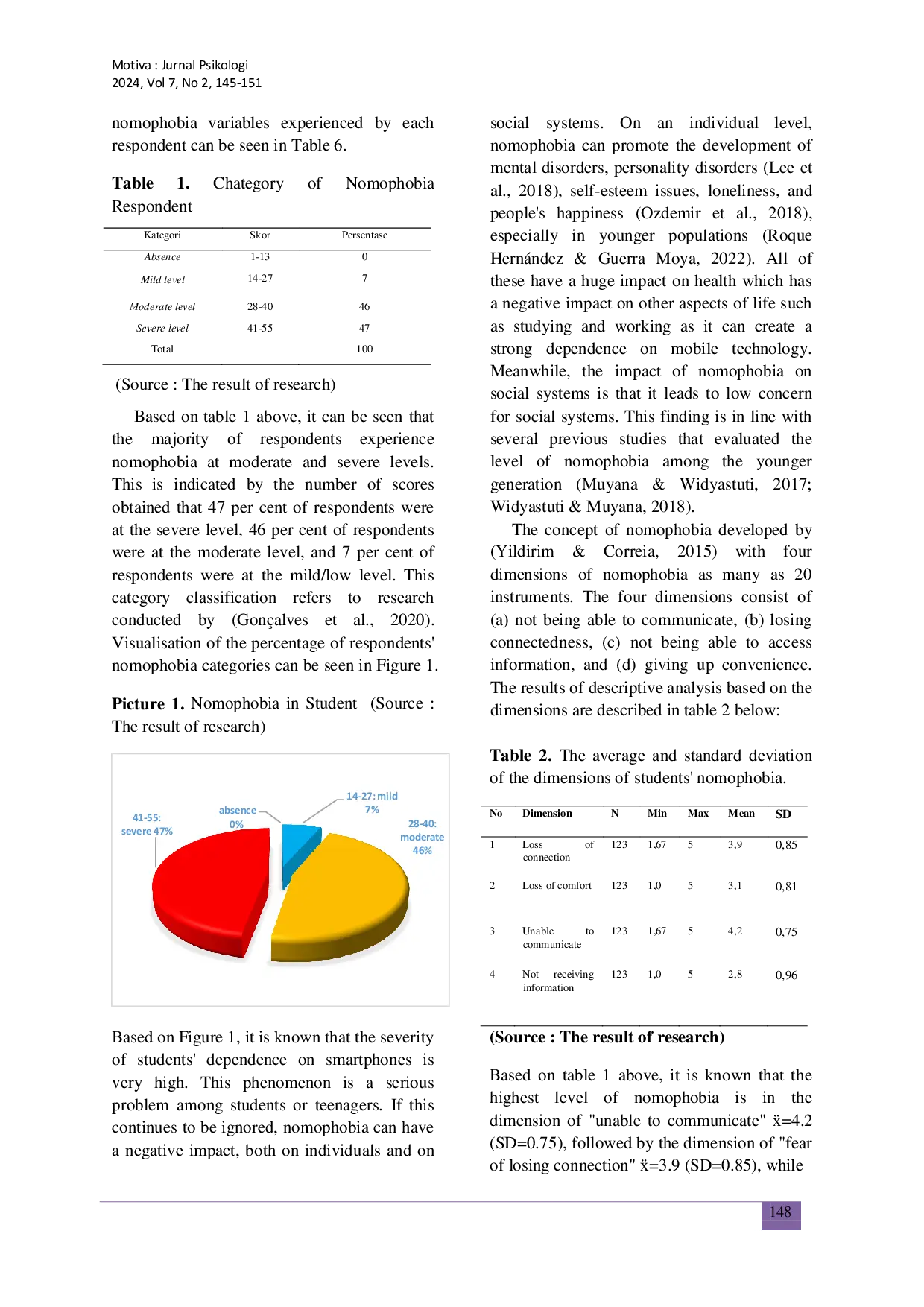 MOTIVA JURNAL PSIKOLOGIMOTIVA JURNAL PSIKOLOGINomophobia (phobia of disconnection from smartphones) has a serious impact on social and mental problems in society, so it is important to measure the high number of nomophobia as an effort to anticipate more serious societal problems. This study aims to determine the level of nomophobia among college students. This research method uses a survey approach conducted on 123 students in West Java. To find out the level of nomophobia among college students, descriptive statistical analysis was applied. The results of the analysis show that most students have a high dependence on smartphones, the level of nomophobia among students, most students are in the moderate and severe categories. The most severe dimension of nomophobia experienced by students is the fear of not being able to communicate and losing connectedness. These findings indicate that the current condition of students is quite apprehensive in terms of their dependence on smartphones. This dependence can have an impact on mental disorders as well as other social problems. Therefore, parents or policy makers need to make regulations or rules that limit smartphone dependency among students (or children in the context of parents).