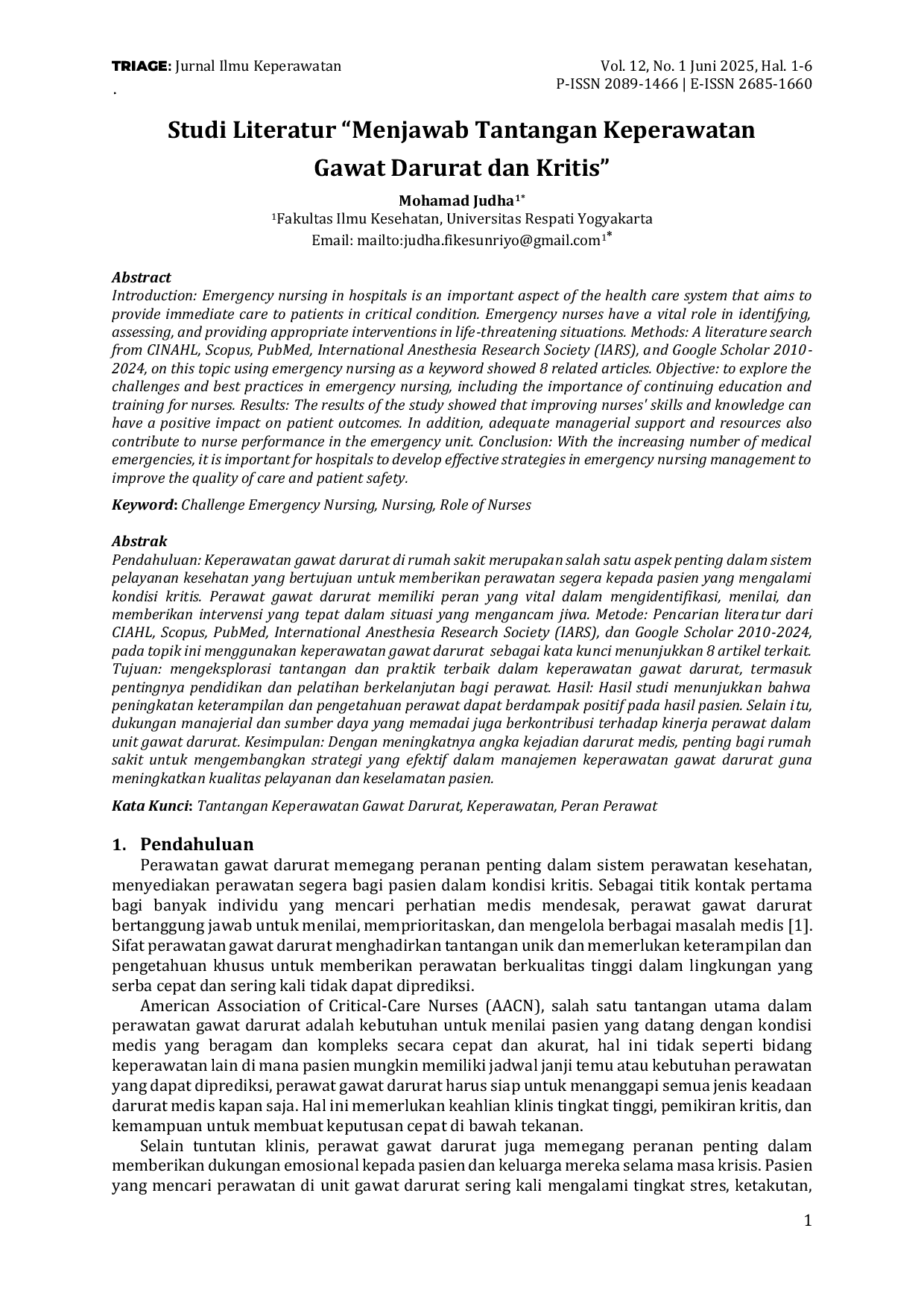 TRIAGE Jurnal Ilmu KeperawatanTRIAGE Jurnal Ilmu KeperawatanKeperawatan gawat darurat di rumah sakit merupakan aspek penting dalam sistem pelayanan kesehatan, bertujuan memberikan perawatan segera kepada pasien dalam kondisi kritis. Perawat gawat darurat memiliki peran vital dalam mengidentifikasi, menilai, dan memberikan intervensi tepat dalam situasi mengancam jiwa. Penelitian ini mengeksplorasi tantangan dan praktik terbaik dalam keperawatan gawat darurat, termasuk pentingnya pendidikan dan pelatihan berkelanjutan bagi perawat. Hasil studi menunjukkan peningkatan keterampilan dan pengetahuan perawat berdampak positif pada hasil pasien. Dukungan manajerial dan sumber daya memadai juga berkontribusi terhadap kinerja perawat dalam unit gawat darurat.