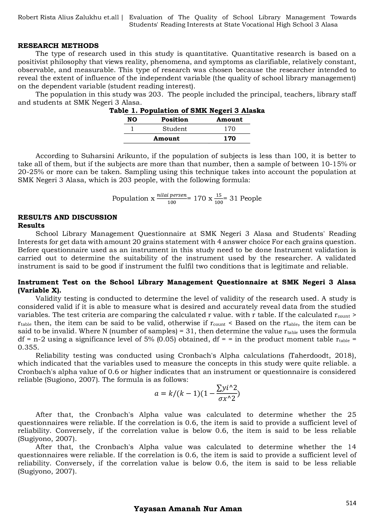 Algebra : Jurnal Pendidikan, Sosial dan SainsAlgebra : Jurnal Pendidikan, Sosial dan SainsPenelitian ini bertujuan untuk mengevaluasi kualitas manajemen perpustakaan dan dampaknya terhadap minat membaca siswa di SMK Negeri 3 Alasa. Perpustakaan sekolah memiliki peran penting sebagai pusat sumber belajar yang mendukung peningkatan literasi dan minat membaca siswa. Metode penelitian menggunakan pendekatan kuantitatif melalui observasi, kuesioner, dan wawancara dengan siswa dan staf perpustakaan. Hasil menunjukkan kualitas manajemen perpustakaan di SMK Negeri 3 Alasa cukup baik, namun masih terdapat kekurangan dalam pembaruan koleksi buku dan pemanfaatan teknologi informasi. Dengan manajemen perpustakaan optimal, diharapkan minat membaca siswa dapat terus meningkat secara berkelanjutan.