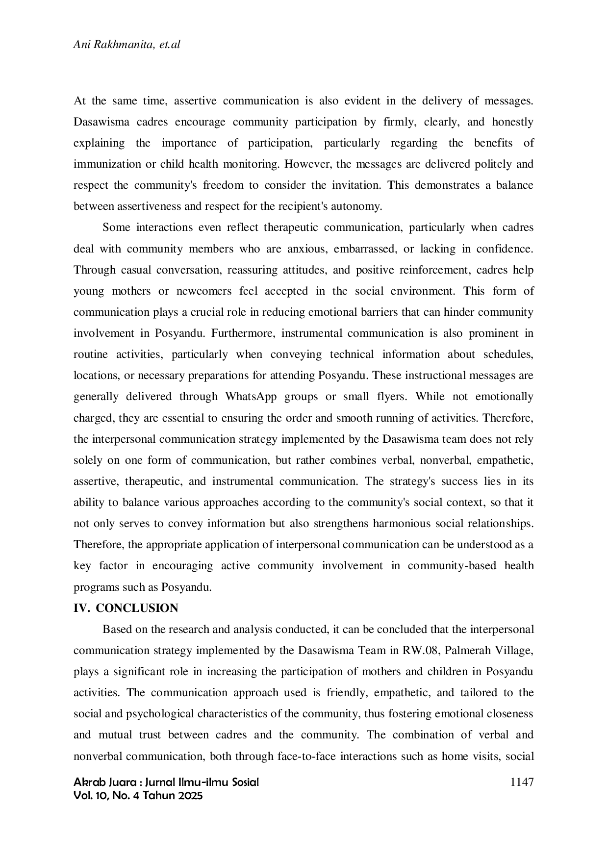 Berdasarkan penelitian dan analisis yang dilakukan, dapat disimpulkan bahwa strategi komunikasi interpersonal yang diterapkan oleh Tim Dasawisma di RW.08, Kelurahan Palmerah, berperan signifikan dalam meningkatkan partisipasi ibu dan anak dalam kegiatan Posyandu.Pendekatan komunikasi yang digunakan bersifat ramah, empatik, dan disesuaikan dengan karakteristik masyarakat, sehingga mampu membangun kedekatan emosional dan kepercayaan timbal balik antara kader dan masyarakat.Kombinasi berbagai bentuk komunikasi, baik secara langsung maupun melalui media digital, terbukti efektif dalam mendorong keterlibatan masyarakat, khususnya ibu rumah tangga dan ibu bekerja.Hasil penelitian ini menegaskan bahwa komunikasi interpersonal yang efektif, empatik, dan berkelanjutan merupakan fondasi utama dalam membangun kesadaran dan partisipasi masyarakat dalam program kesehatan berbasis komunitas seperti Posyandu.