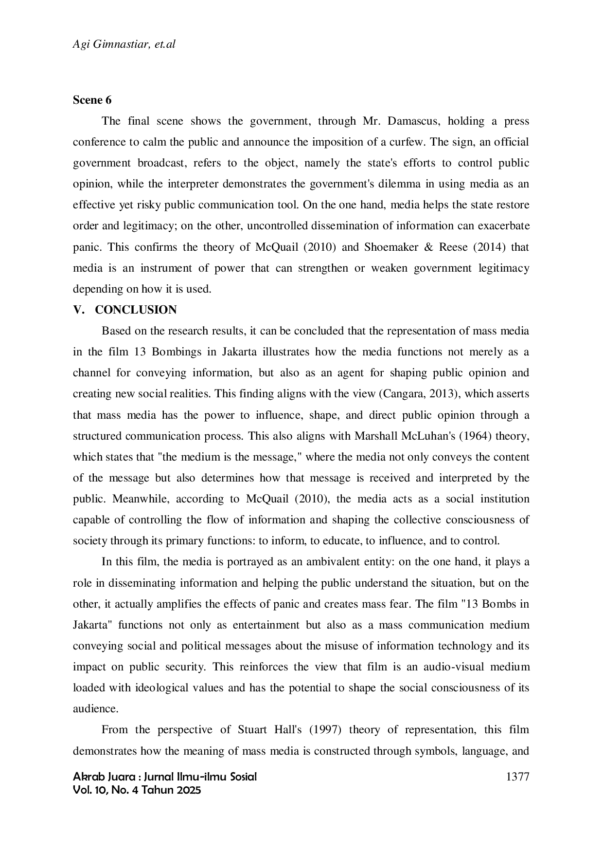 Akrab Juara : Jurnal Ilmu-ilmu SosialAkrab Juara : Jurnal Ilmu-ilmu SosialPenelitian ini bertujuan untuk menganalisis representasi media massa dalam penyebaran informasi teror pada film 13 Bom di Jakarta. Film tersebut menampilkan bagaimana kelompok teroris memanfaatkan media sebagai sarana untuk menebarkan ketakutan melalui penyiaran ancaman di televisi dan platform digital, serta bagaimana pemerintah menggunakan media untuk memberikan imbauan dan membangun solidaritas publik. Penelitian ini menggunakan pendekatan kualitatif deskriptif dengan metode analisis semiotika Charles Sanders Peirce, yang meliputi tiga elemen utama: ikon, indeks, dan simbol. Data dikumpulkan melalui observasi terhadap adegan-adegan yang menampilkan peran media dalam alur cerita film. Hasil penelitian menunjukkan bahwa media massa dalam film ini memiliki peran ganda, yakni sebagai instrumen penyebar teror dan sebagai alat kontrol informasi oleh negara. Representasi tersebut menggambarkan realitas sosial di mana media berfungsi tidak hanya sebagai penyampai informasi, tetapi juga sebagai pembentuk opini publik dan konstruksi persepsi terhadap isu terorisme.